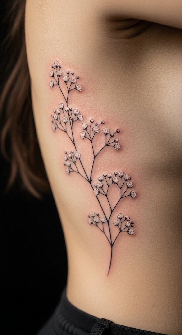 An intimate ribcage baby’s breath tattoo provides a private canvas for expression. Picture flowers along your side for a hidden gem. This area allows for larger designs that feel personal. Draw it out on your body with safe markers to check placement. Free online tools let you edit photos of yourself wearing the idea. Seek artists with flat rates around $120. Incorporate a simple curve to make it unique on a budget. Follow step-by-step guides online to prepare your skin at home. The ribcage offers space for growth-themed elements. Keep it covered initially with breathable fabrics from your wardrobe. This spot suits those seeking deeper, more secluded ink.