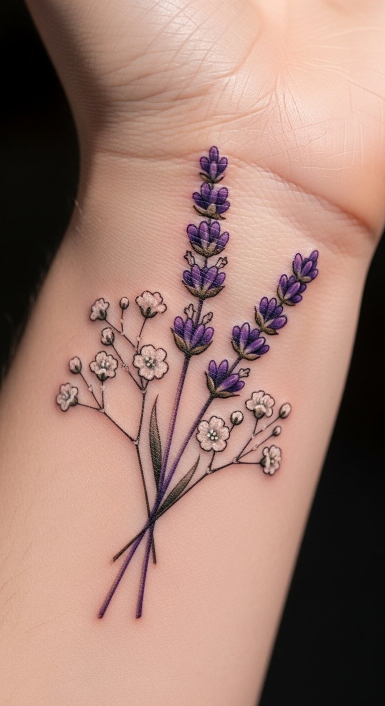 A baby’s breath and lavender pairing tattoo mixes calm vibes effortlessly. Imagine white flowers with purple accents on your wrist. This duo creates balance with ease. Sketch both on paper using colored pencils first. Free apps provide templates to combine them fast. Artists may offer combo discounts for about $90. Toss in a small bud for variety on a budget. Watch simple videos to blend colors at home. Position it for daily visibility without hassle. Protect it with sunscreen you already own. This design suits relaxation seekers perfectly.