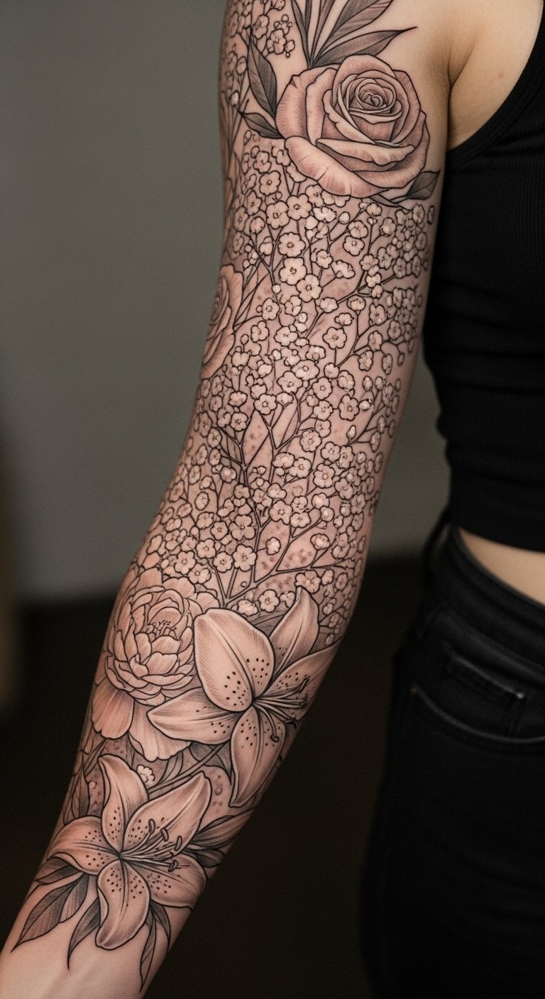 A full bouquet sleeve baby’s breath design creates a garden on your arm. Envision multiple flowers cascading from shoulder to wrist. This larger piece tells a story over time. Break it into sections and sketch each part. Free resources online help build the pattern step by step. Artists might split payments, starting at $200 total. Layer in affordable details like leaves. Follow DIY videos to draw similar elements. Place it for versatile coverage. Use household oils for aftercare. This option suits those who love elaborate art.