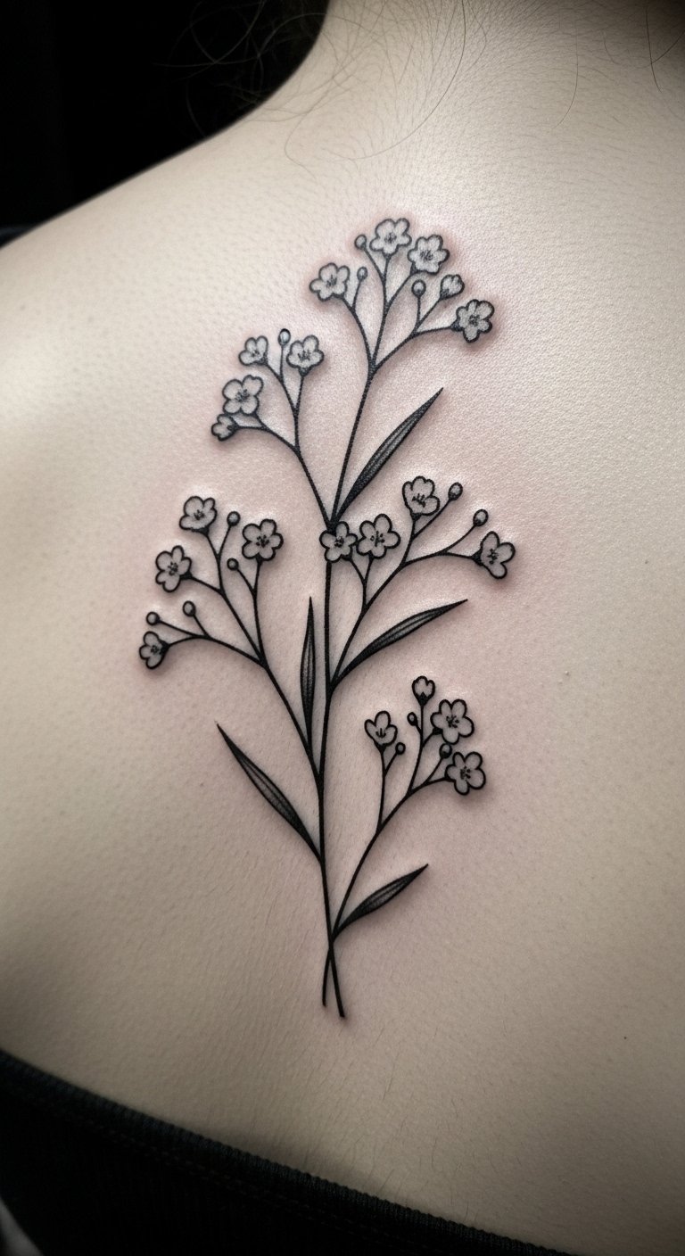 A black and white baby’s breath tattoo keeps it classic and sharp. See outlined flowers on your back for timeless appeal. This style focuses on lines without color cost. Practice with black markers on paper first. Free graphic tools offer monochrome templates. Local artists price it at $70 or less. Add faint details for depth on a budget. Snap photos to preview on your phone. It’s easy to maintain with soap you own. Perfect for minimalist fans.