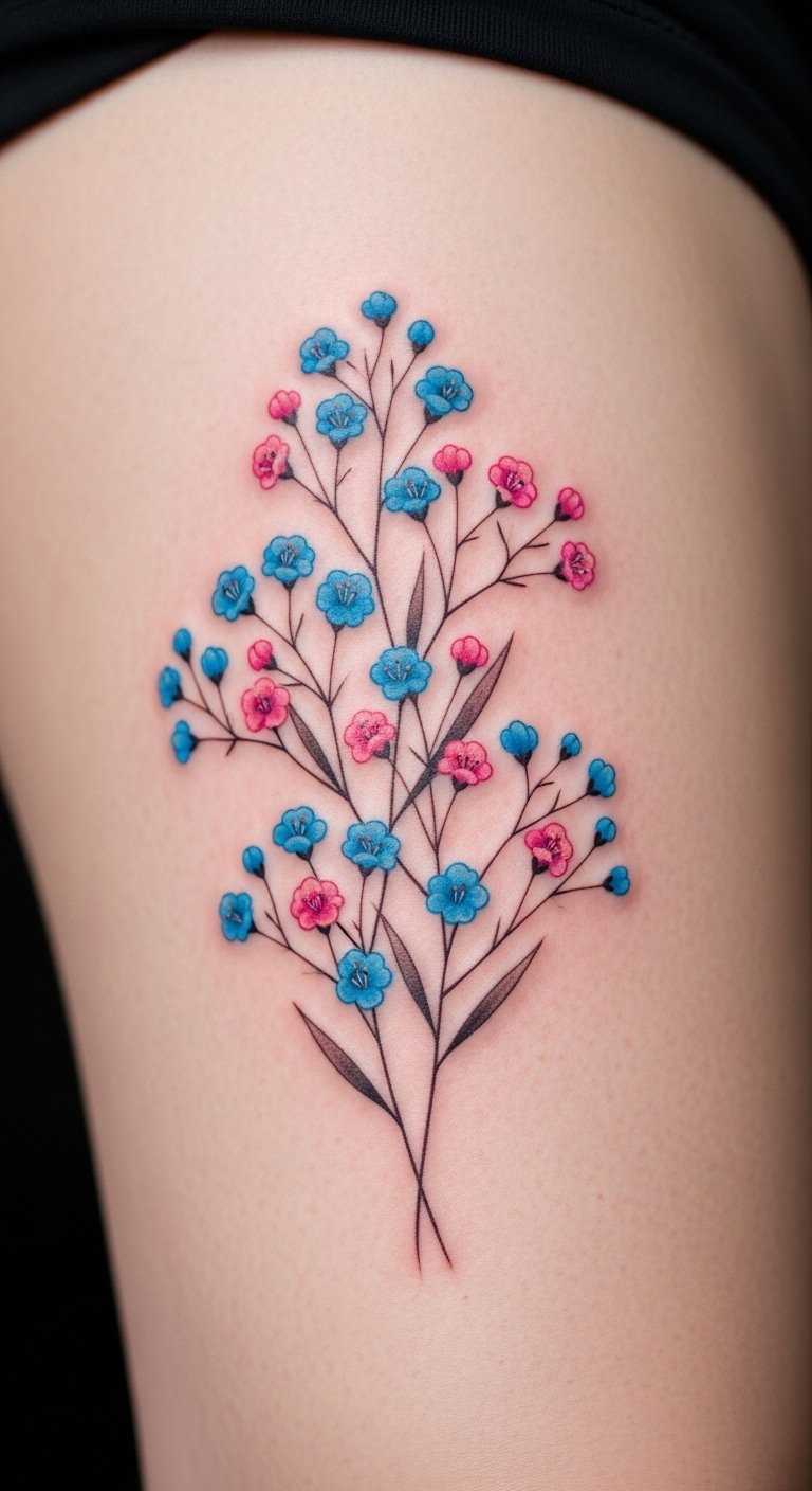 A colored petals baby’s breath variation adds fun pops to your thigh. Imagine flowers with light tints for a fresh spin. This tweak makes it uniquely yours. Experiment with colored pencils on sketches. Apps provide free color options to try. Costs stay under $130 with simple pigments. Mix in a new shade for personalization. Watch quick tutorials for color ideas. Position it for occasional show. Protect with lotion from home. Great for creative types.