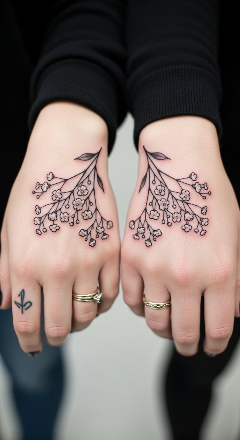 Couple’s matching baby’s breath tattoos build shared bonds. Picture the same flowers on your hands for unity. This design strengthens connections simply. Draw matching sketches together at home. Free sites have pair ideas ready. Dual sessions might cost $100 each. Add a shared element like a line. Use string to outline on each other. Place them visibly for reminders. Care with shared creams. Ideal for partners.