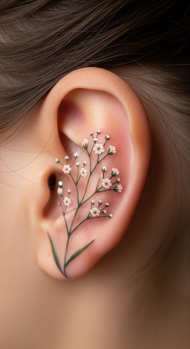 A behind ear baby’s breath tattoo offers a sneaky spot for whimsy. Envision a tiny cluster hidden by hair. This area is quick and discreet. Mark it with ear buds first. Free apps simulate the look fast. Artists charge about $50. Include a curve for fun. Test with stickers you buy cheap. Keep it covered with hats. Use ear oil for care. Perfect for subtle statements.