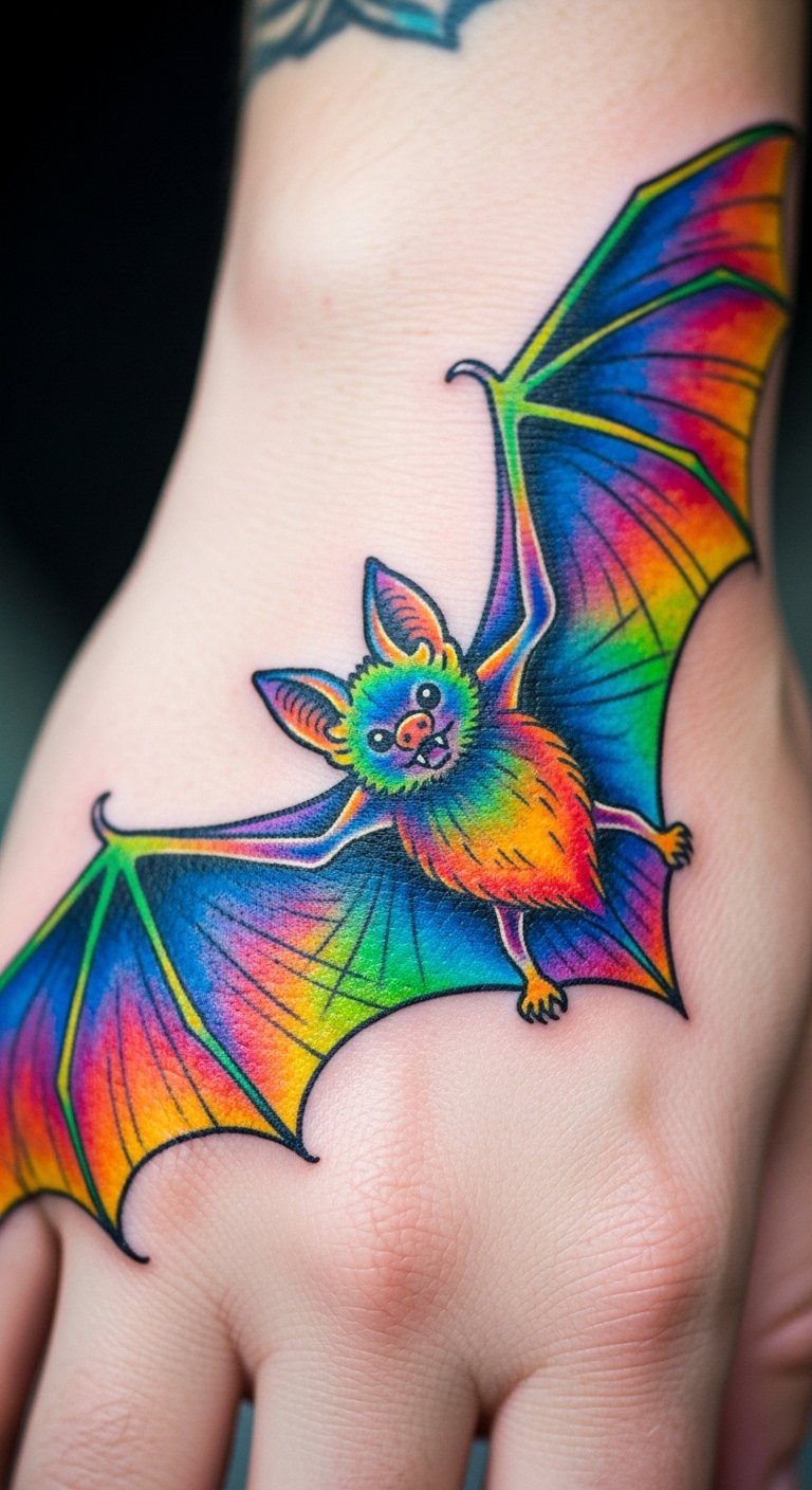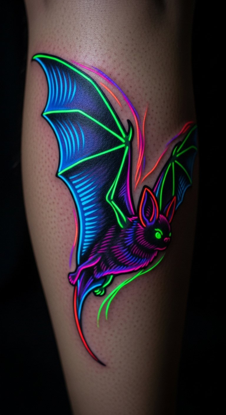 Bright colors are back in a big way for tattoos. Picture a bat with neon pinks and blues that pop. Grab colored pencils and draw this on paper at home. It’s a fun, no-cost way to test ideas. Focus on the wings with electric shades for that eye-catching feel. Visit a budget tattoo shop that specializes in color work—they often have deals. Aim for smaller sizes to cut expenses. Try a DIY mock-up on your skin with body paint from a dollar store. This lets you see how it looks in real life. Place it on your ankle for a subtle vibe. Use simple tools like phone apps to mix colors digitally first. Keep the design balanced so it doesn’t overwhelm. This approach makes tattooing accessible and exciting.