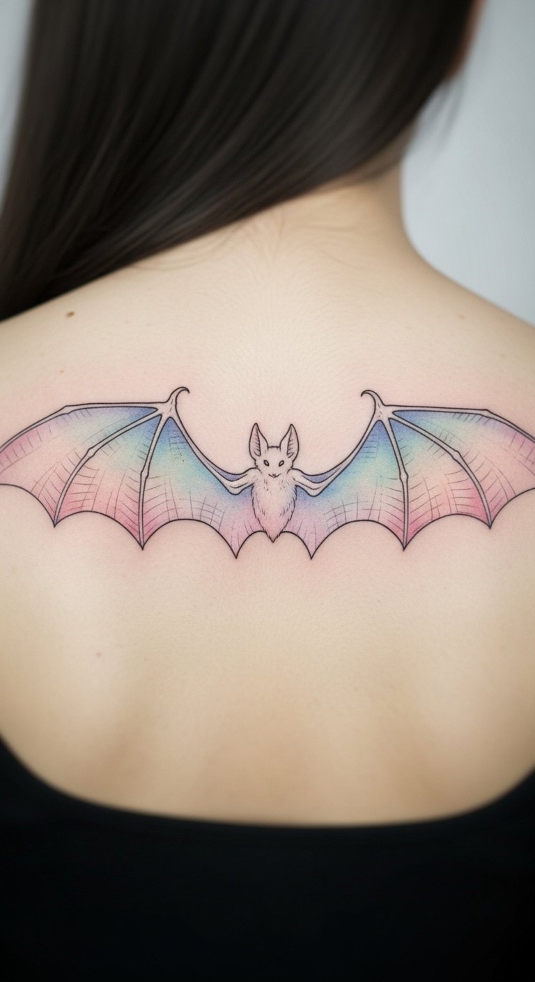 Soft pastels give bats a dreamy touch. Imagine wings in light purples and blues that flow gently. Sketch this with pastels on paper to start cheap. Draw the wings curved for a elegant shape. Show your sketch to an artist at a community event; they might offer lower prices. Practice with affordable face paints on your arm. This helps you visualize the final look. Choose a spot like your shoulder for comfort. Keep the design small to save on ink costs. Use free online editors to add pastel effects to photos of yourself. Make sure it tells your story, like representing calm nights. This method keeps things practical and fun.