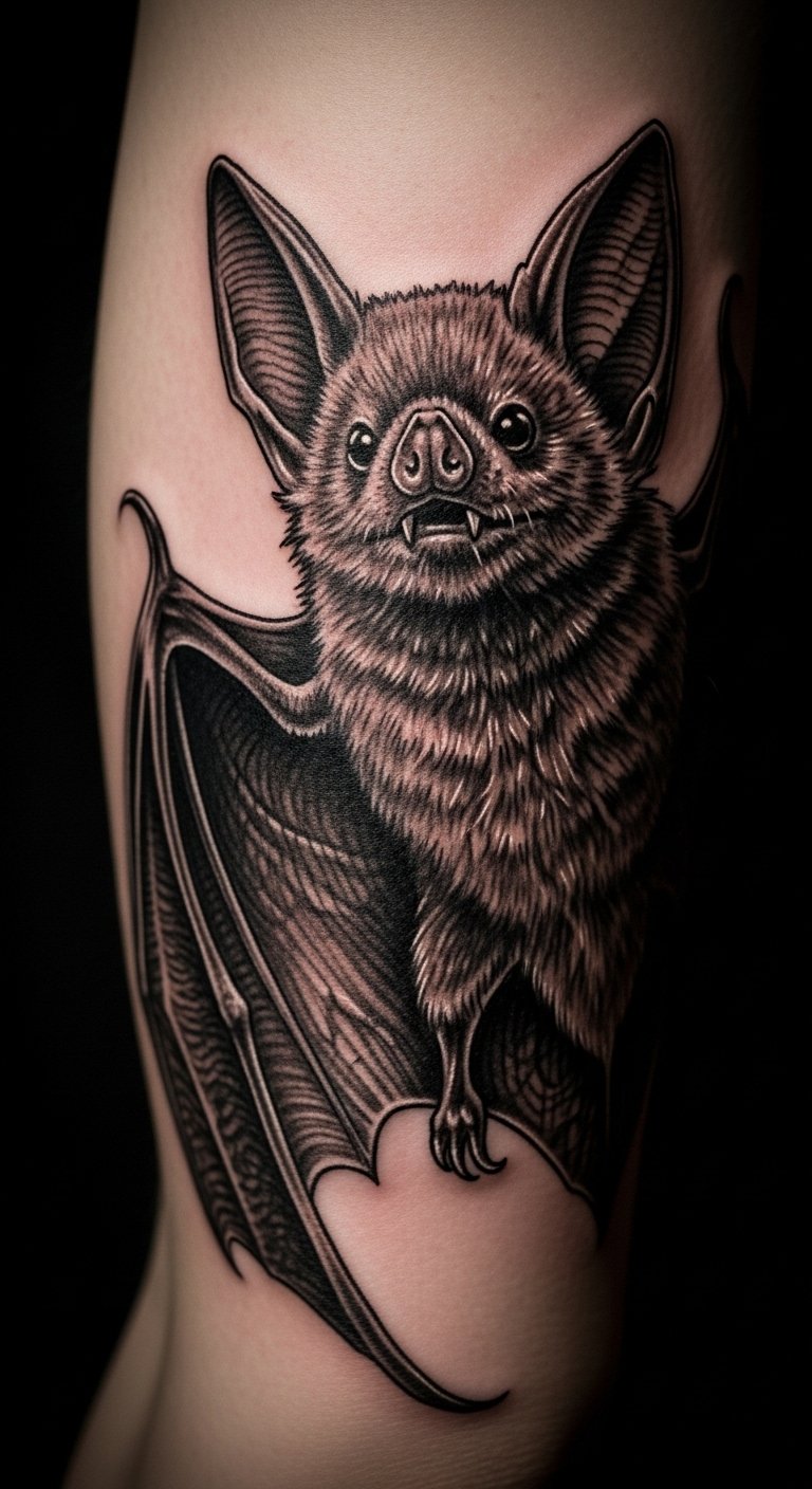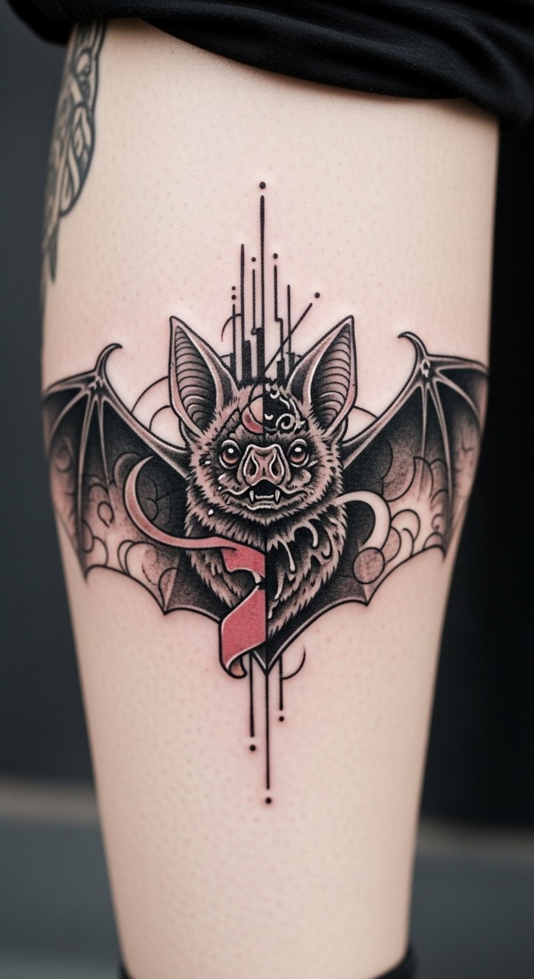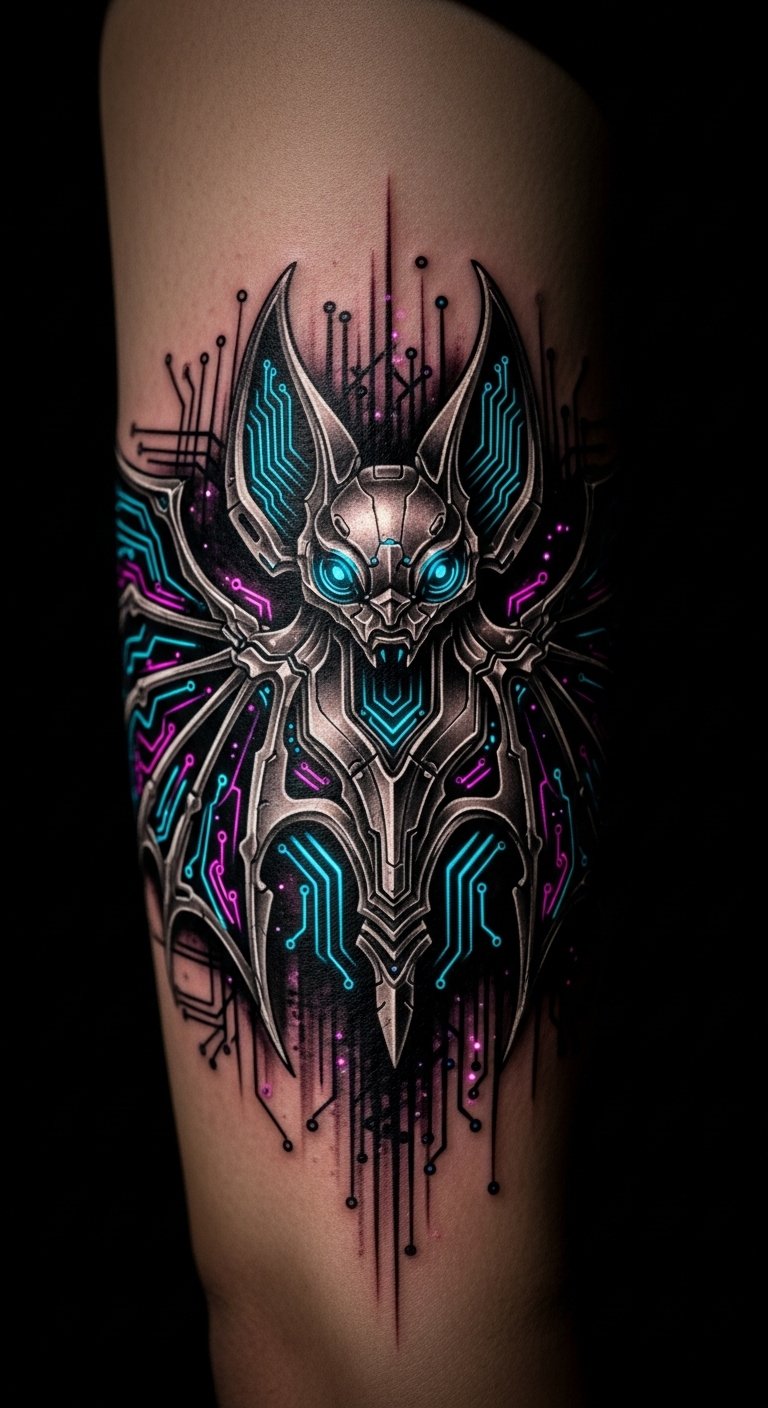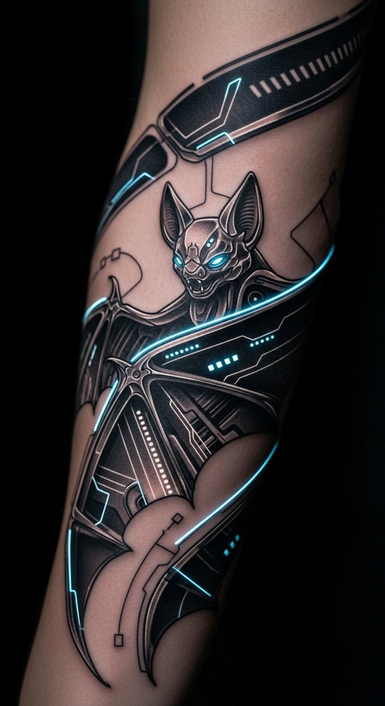 Add tech vibes to your bat with metallic lines. Picture circuits weaving through the wings. Sketch it using a pen and scrap paper at no cost. Include simple tech symbols for a modern twist. Look for artists who handle digital styles; check local listings for affordable options. Test with metallic markers on your skin first. Place it on your forearm for visibility. Keep the design compact to save money. Free software can overlay circuits on bat images. This makes your tattoo feel current and personal.