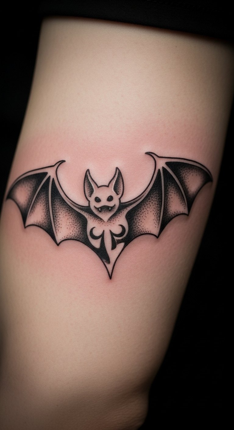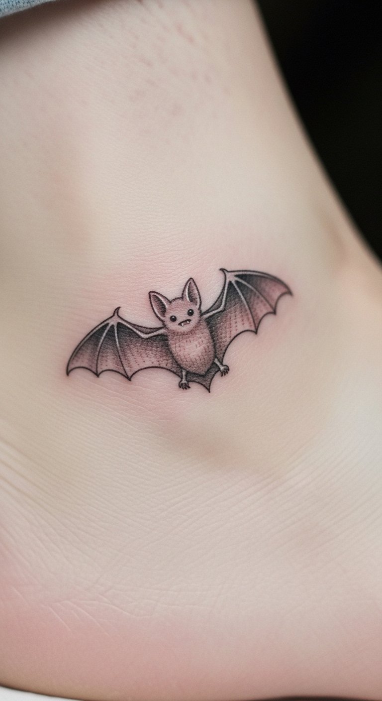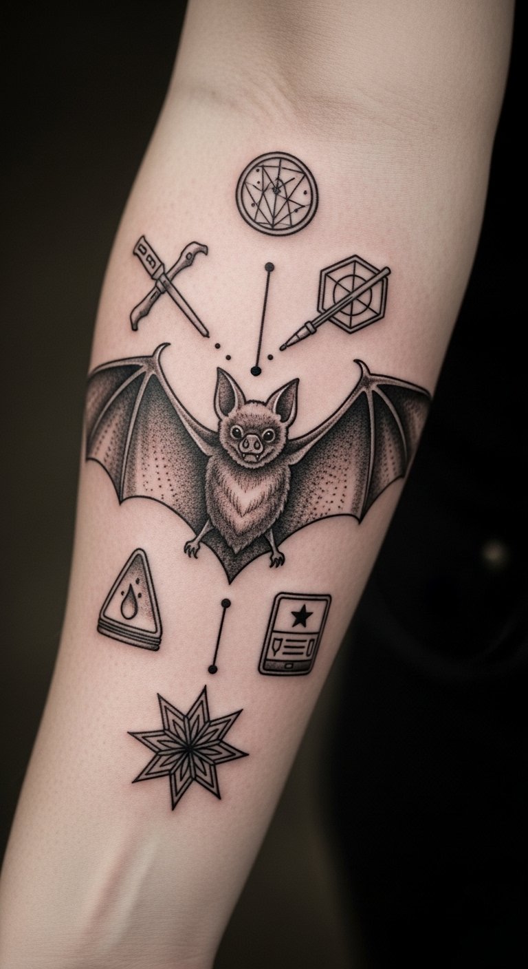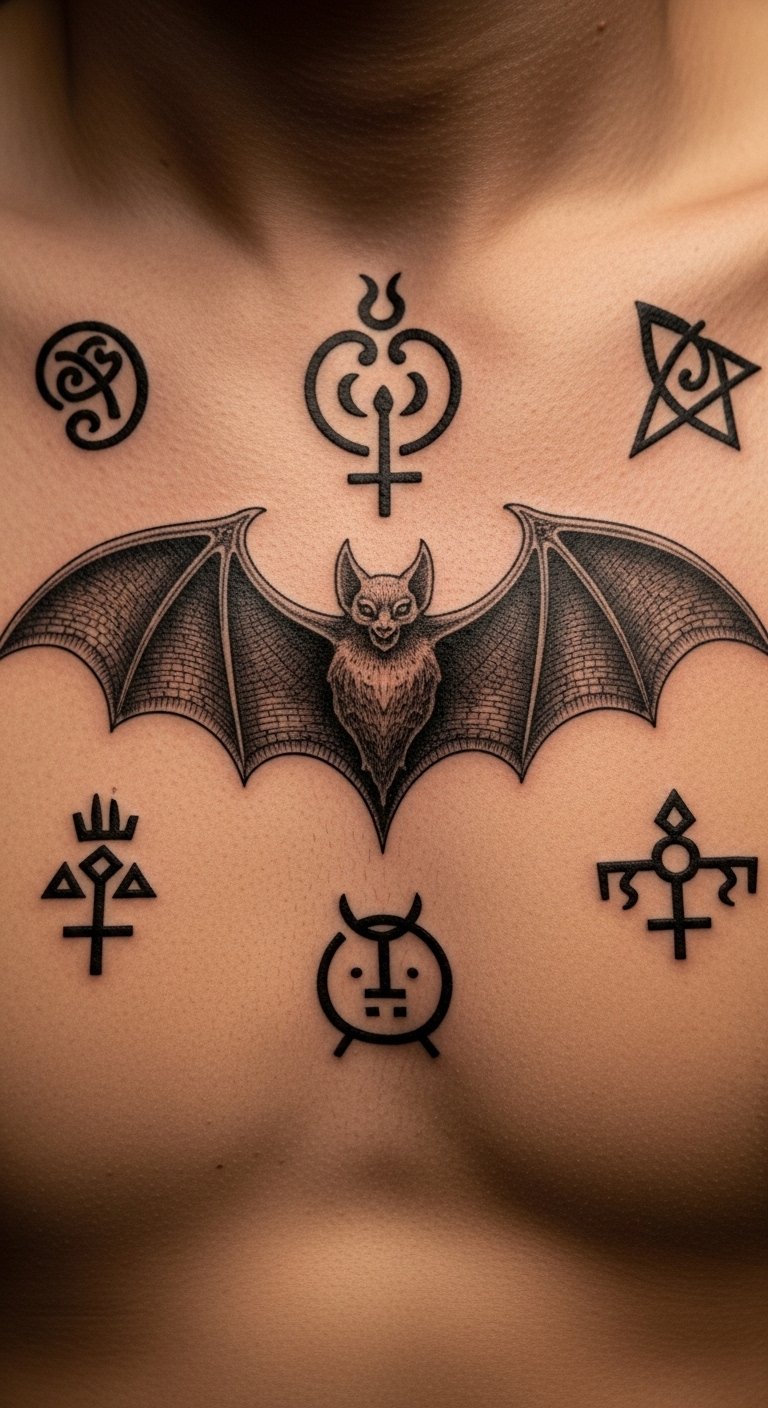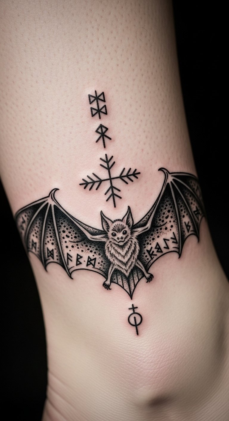 Blend old symbols into your bat for depth. Think of adding runes around the body. Draw this on paper with a basic pen to start. Research symbols online and incorporate them simply. Contact artists who focus on symbolic work; they might have package deals. Use temporary tattoos from stores to try it out. Position it on your foot for discretion. Go small to keep costs down. Drawing apps let you combine elements easily. This design adds meaning without complexity.