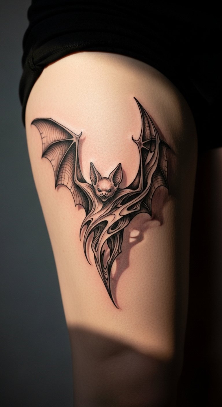 Make your bat change forms for a surreal effect. Imagine wings turning into other shapes. Create a rough draft with crayons on paper. Experiment with blending forms in your sketch. Find collaborative artists through social media; they often price fairly. Apply washable paints to test the look. Put it on your leg for a bold statement. Choose a medium size for budget reasons. Online tools help morph images digitally. This keeps the process engaging and affordable.