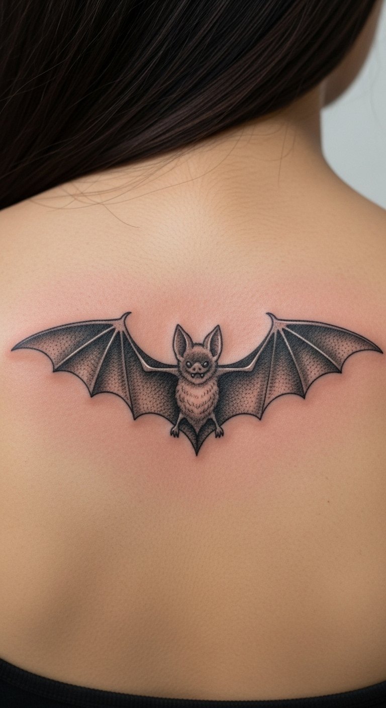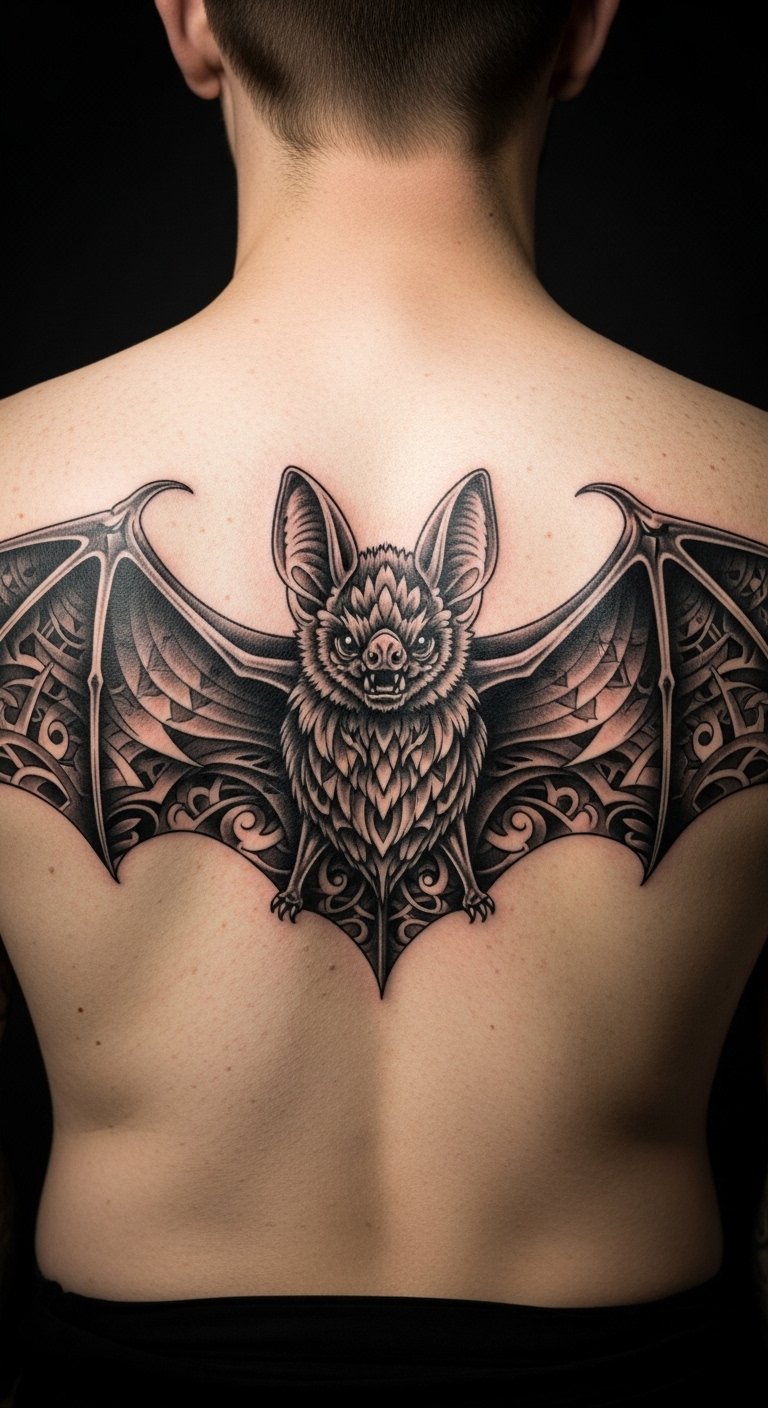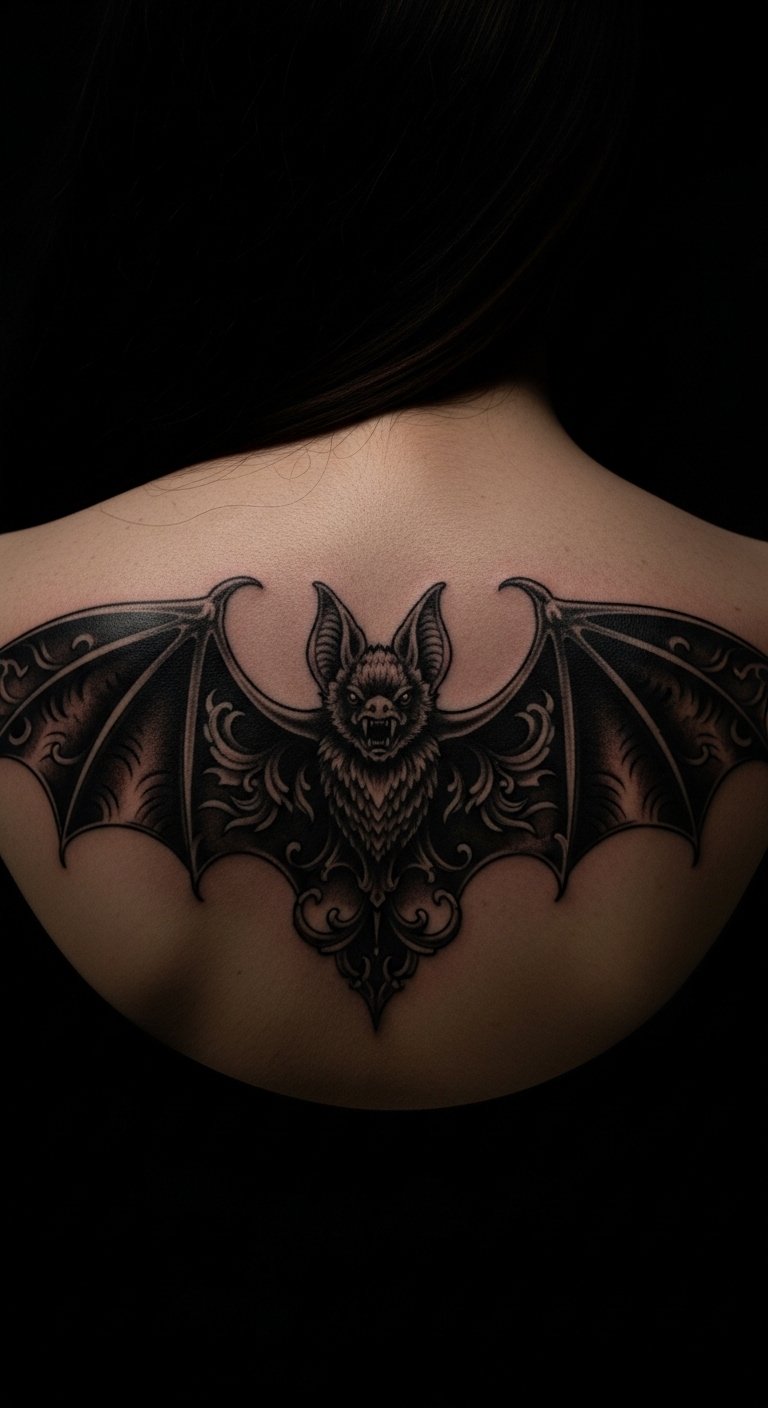 Go dark and detailed for a gothic bat. Envision intricate patterns on a large scale. Sketch it with a marker on paper first. Add gothic elements like spikes simply. Search for specialized artists and compare rates. Use black eyeliner to preview on your back. Place it centrally for impact. Opt for outlines to cut costs. Free design software aids in planning. This approach makes it personal yet practical.