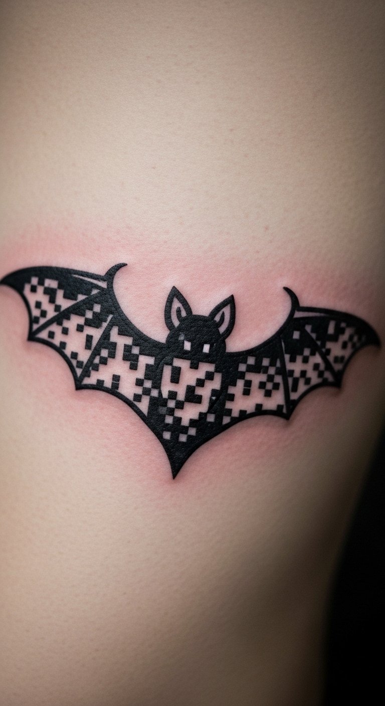 Add pixel effects for a digital bat. Draw pixels on paper grids. Keep it grid-based for ease. Contact digital-style artists for quotes. Use phone stickers to preview. Place on your side. Pixels mean less ink cost. Digital tools plan perfectly. This feels modern and simple.