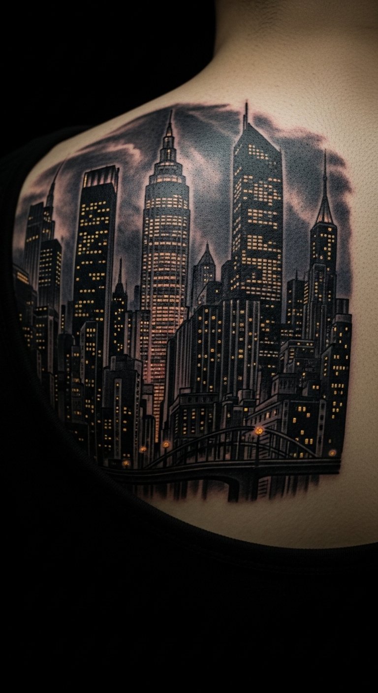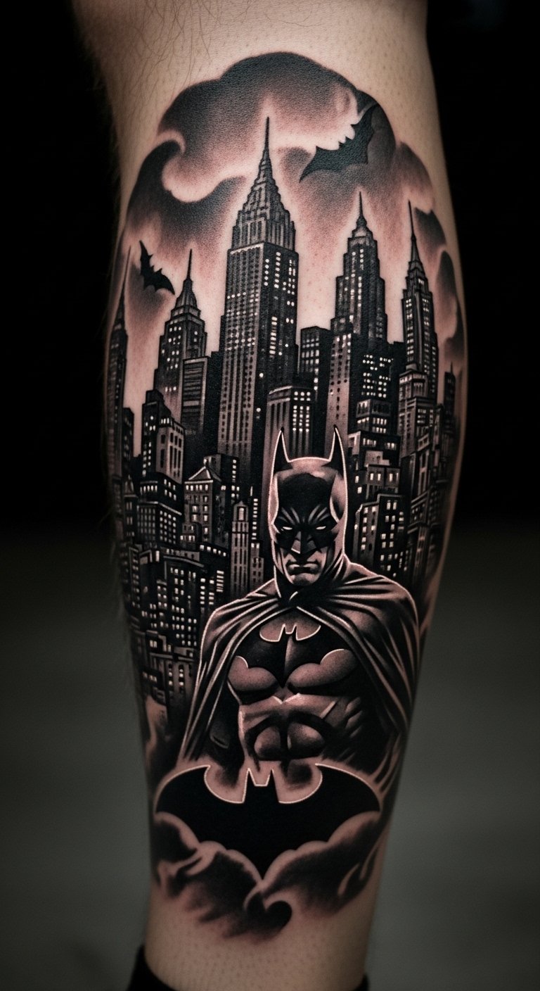 Nighttime Gotham scene sets the mood. Include lights and shadows. Place on your back for scene. It’s atmospheric and immersive. Find scene pros for $230. Sketch scenes on paper. Use dark shades. Add lights. Real talk: Choose dark inks for effect. Healing needs shade. Use coverings. You’ll scene your world. Try night drawings. It’s cost-effective.