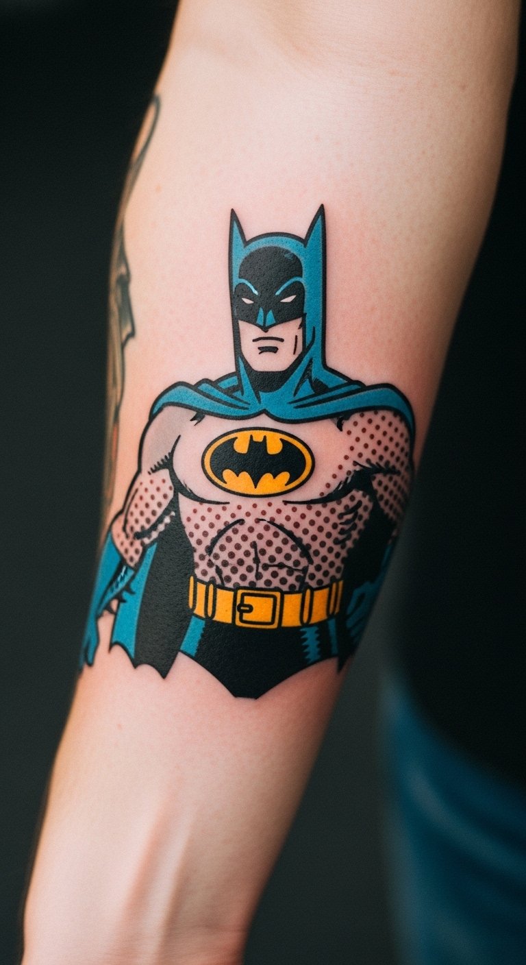 Vintage comic style Batman nods to origins. Use halftone dots and old looks. Place on your forearm for fun. It’s nostalgic and playful. Find comic pros for $150. Sketch dots at home. Use stippling techniques. Keep it era-true. Real talk: Pick erasable tools for planning. Healing needs gentle washes. Use what you have. You’ll comic-ize your look. Practice with comic books. It’s free.