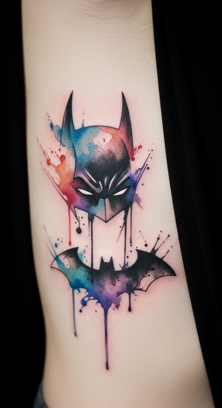 Watercolor Batman elements blend softly. Mix colors like paint. Position on your rib for art. It’s artistic and light. Look for watercolor sessions at $200. Experiment with blends on paper. Use watercolors at home. Start simple. Real talk: Go for washable tests first. Healing requires moisture. Use basic lotions. You’ll paint your story. Try home watercolor kits. It’s budget-smart.