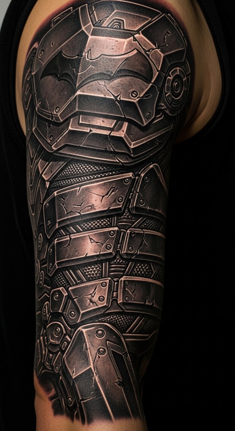 Armored Batman suit details protect in ink. Show plates and gear. Position on your bicep for strength. It’s protective and cool. Seek detail artists for $210. Draw plates at home. Use references. Add details. Real talk: Go for layered looks. Healing requires patience. Use soft touches. You’ll suit up daily. Practice with armor sketches. It’s affordable.