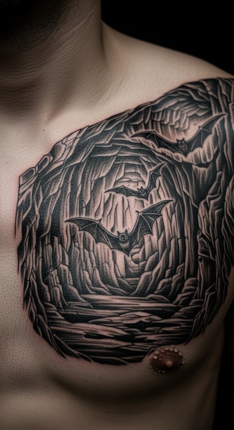 Bat cave elements hide your ink. Use rocks and bats. Put on your chest for mystery. It’s secretive and fun. Look for elements for $180. Draw caves at home. Use textures. Add elements. Real talk: Opt for hidden spots. Healing is straightforward. Use basic care. You’ll cave in style. Practice with rock rubbings. It’s simple.