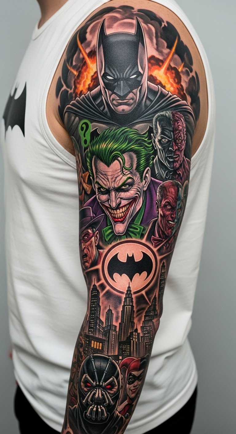 Full sleeve Batman epic covers your arm. Include multiple elements. It’s a big commitment. Perfect for die-hards. Seek sleeve specialists for $300. Plan sections at home. Use story ideas. Add epic touches. Real talk: Break it into sessions. Healing takes time. Use layered care. You’ll epic-ize your look. Try arm bands for previews. It’s smart.