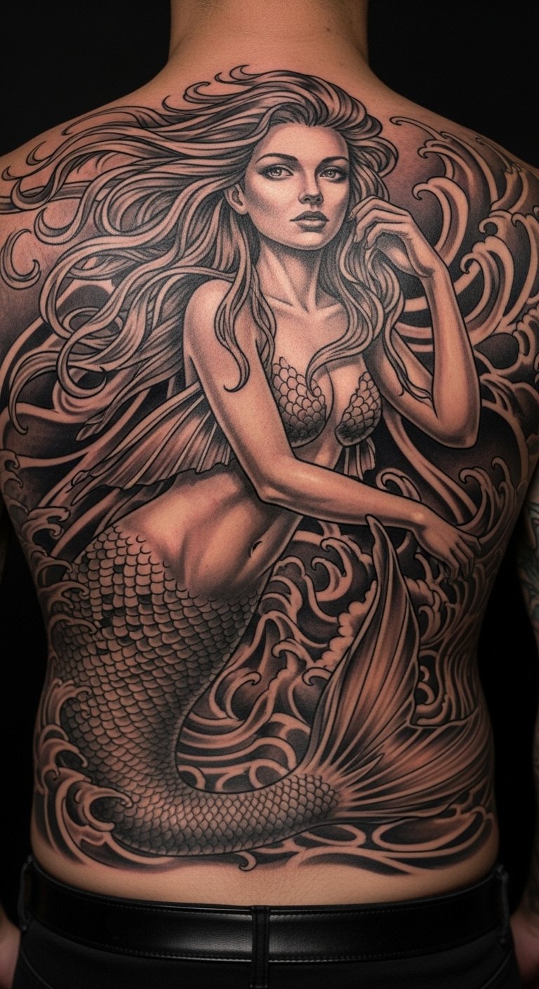 Mermaid tales spark fantasy. Imagine a figure on your back for epic feel. Sketch poses at home. Apply fake tattoos for tests. Go for outlines to reduce costs. Set on your upper back for impact. Customize with a tail twist. This method is engaging and low-cost. Find fantasy artists nearby. Tend with daily habits. These choices ease the journey.