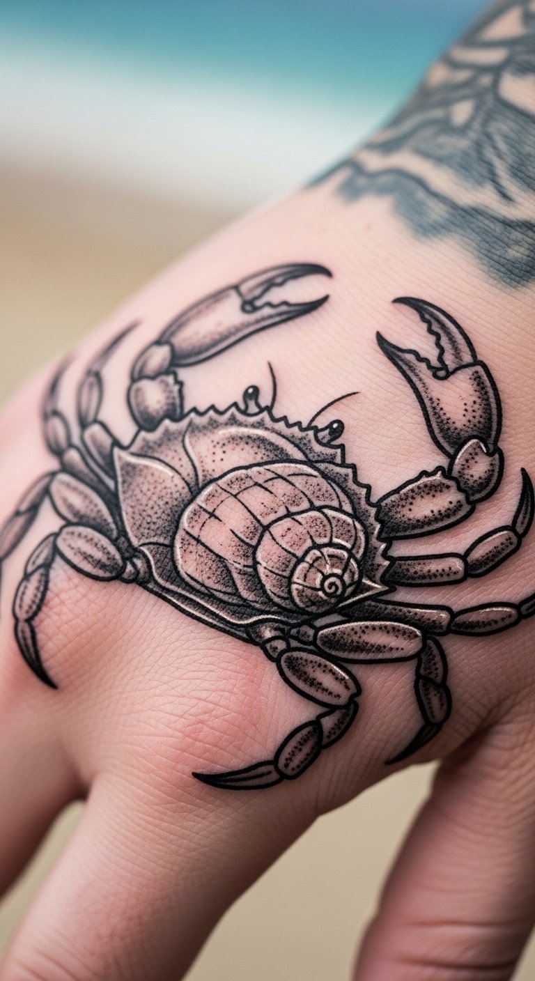 Crab claws add edge. Think of one on your hand for grip. Draw claws at home. Use temporary crabs for previews. Keep it detailed yet small for budgets. Set on your hand for practicality. Add sand with tools. This approach is useful and cheap. Find claw specialists locally. Protect with basics. Quick steps make it fun.