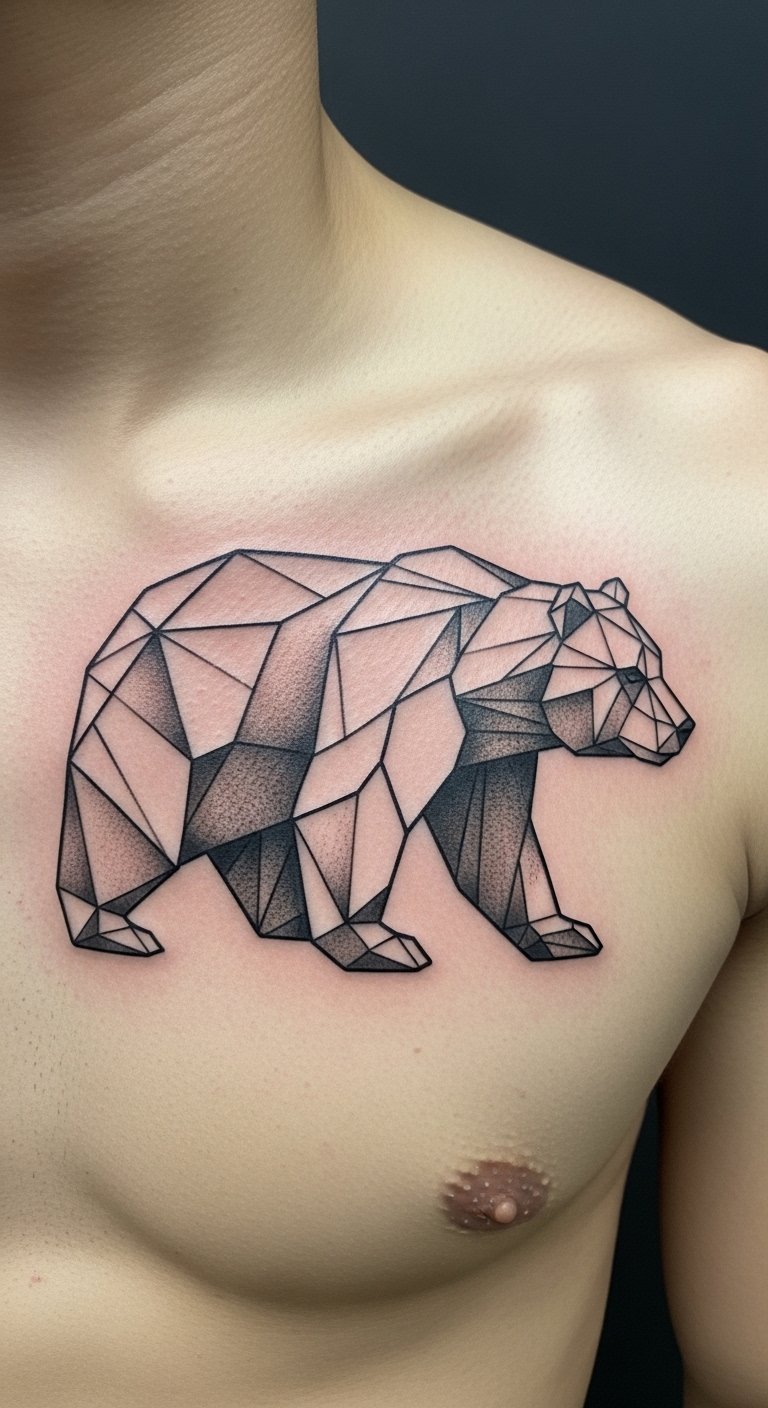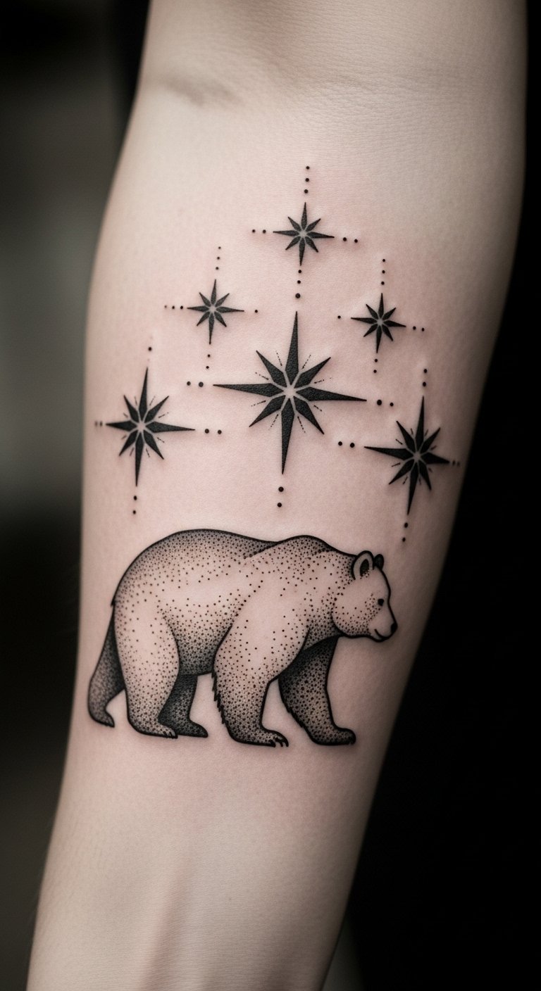Go for a geometric bear if you like clean, modern vibes. This style turns the bear into sharp angles and shapes. Start by printing free templates online and tracing them on paper. Practice with a ruler and pen for a DIY mockup at no cost. Smaller designs fit budgets better, so aim for your forearm. Combine it with simple dots for extra flair without added expense. The bold patterns stand out on their own. Use this as a base for more ideas, like adding stars. It’s a quick way to make a statement and feel confident in your choices.