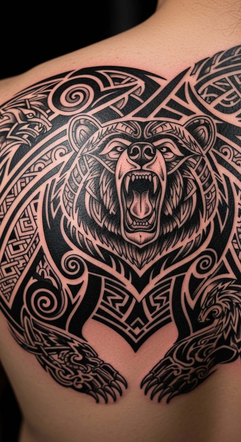Tribal bear tattoos honor traditions with strong, patterned lines. Draw from online resources to create your own version on paper. This DIY hack lets you customize without extra fees. Choose black ink to keep costs down. Place it on your shoulder for balance. Mix in personal symbols using free design apps. The style is versatile and fits various spots. It’s an affordable way to connect with heritage and add depth to your story.