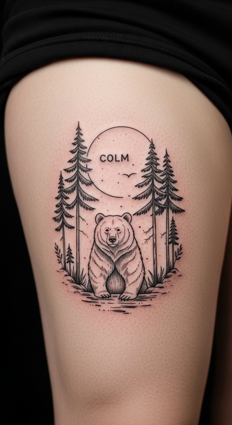 A calm bear in a forest scene offers tranquility on your skin. Use leaves from your yard to trace nature elements at home. This DIY tip keeps things cheap and personal. Keep the design compact to reduce expenses. Place it on your thigh for privacy. Blend in trees with easy drawings. It’s a simple way to find peace through ink.