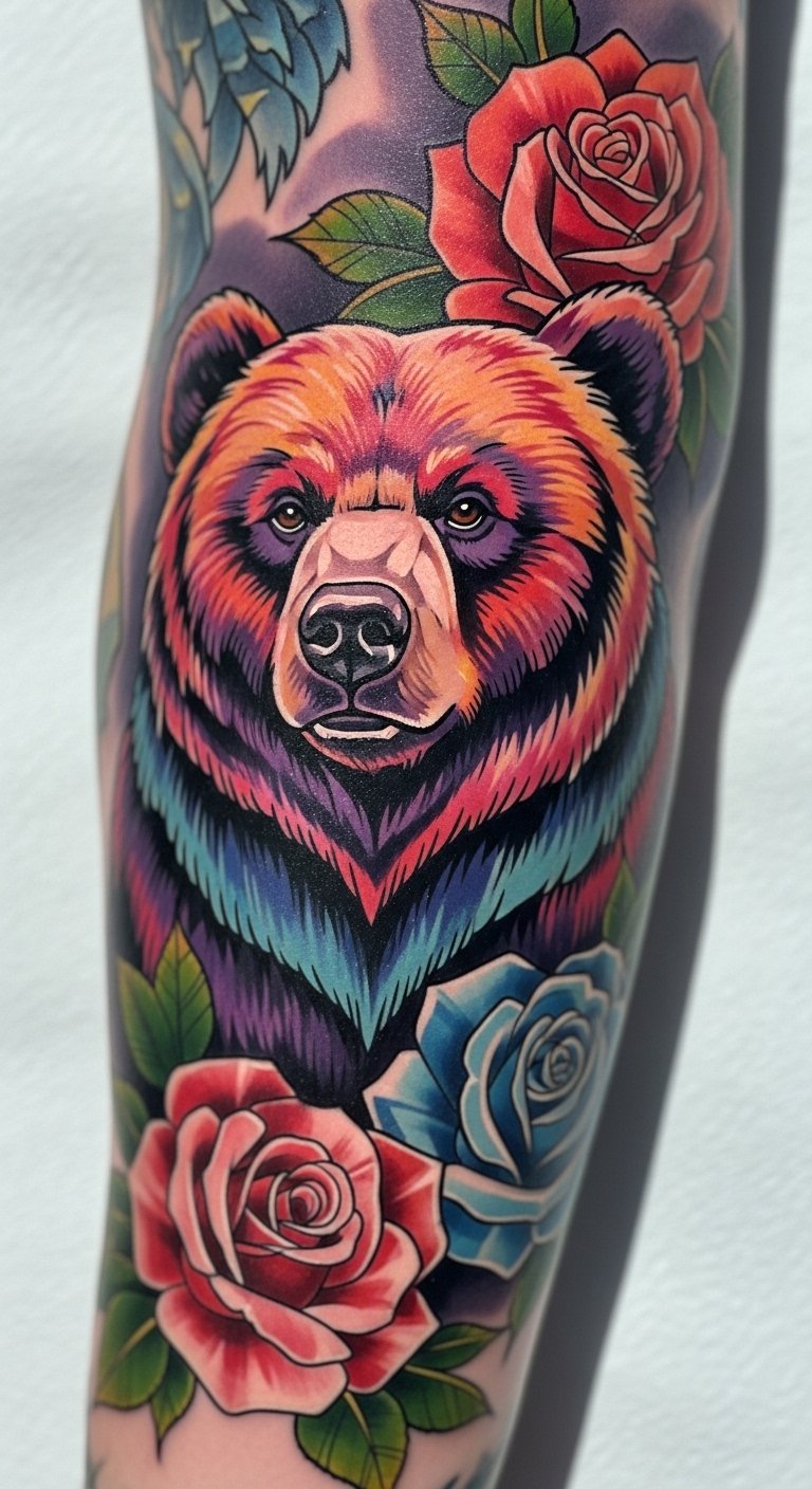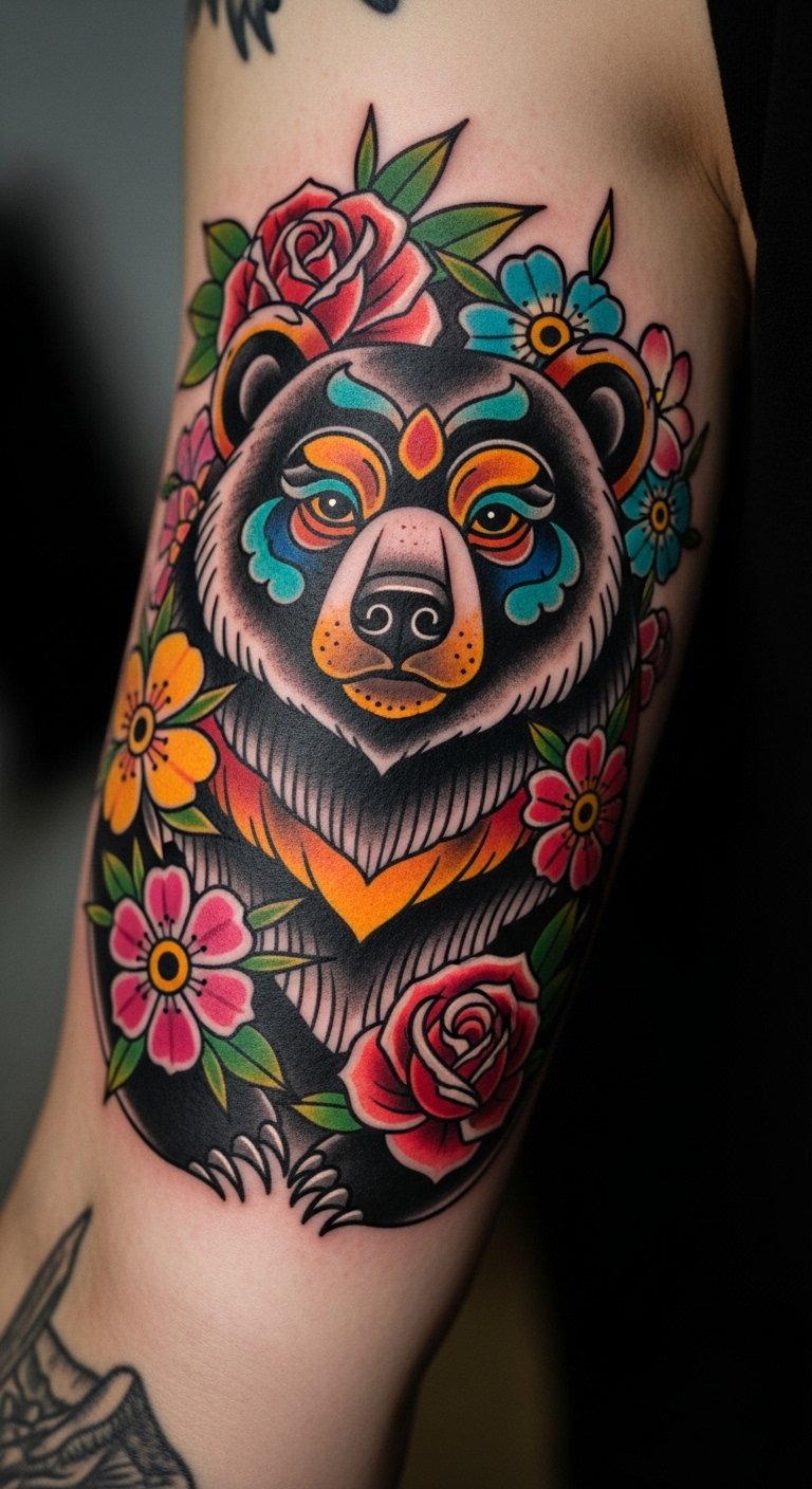 Neo-traditional bears with flowers add vibrant energy. Experiment with flower drawings from books at home. This saves on initial costs. Choose fewer colors for affordability. Put it on your arm for show. The mix brings joy and strength together easily.