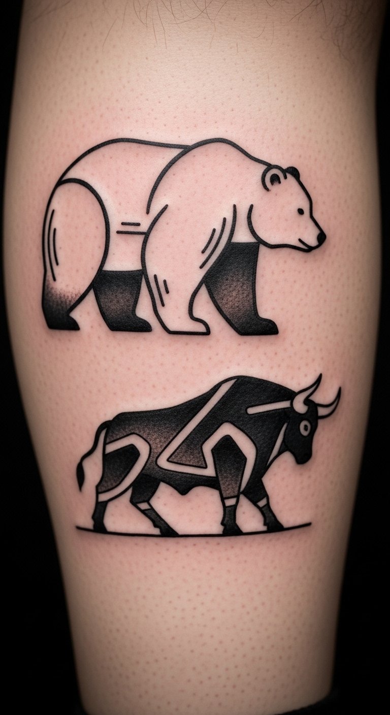 A bear and bull duo represents life’s cycles. Sketch both on paper to start. This DIY approach saves cash. Keep it straightforward for costs. Put it on your leg for impact. It’s an easy way to symbolize balance.