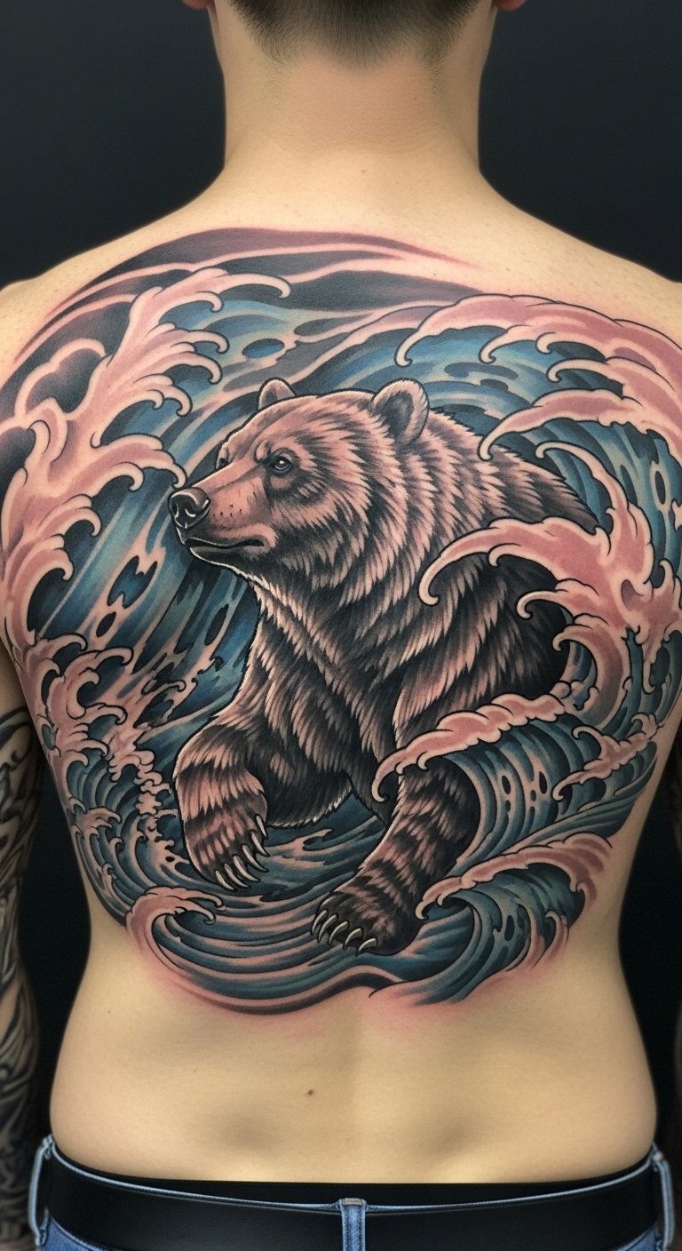 A bear in waves brings movement to ink. Practice blending colors on paper. This at-home activity costs little. Keep it moderate in size. Position it on your back. It’s a fluid, accessible design for all.