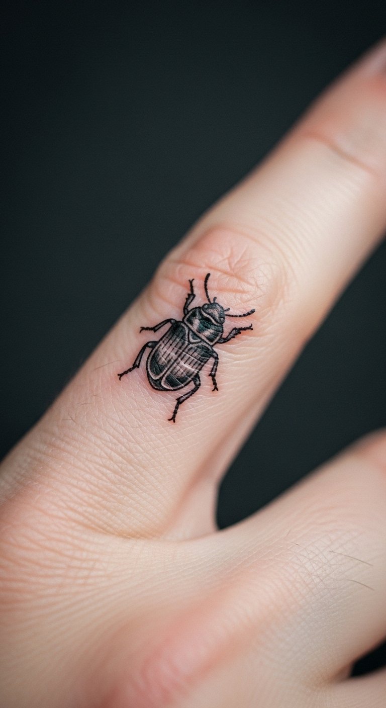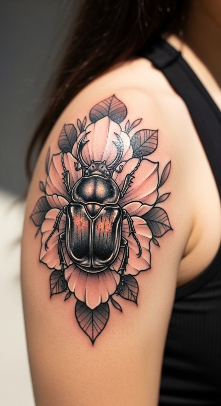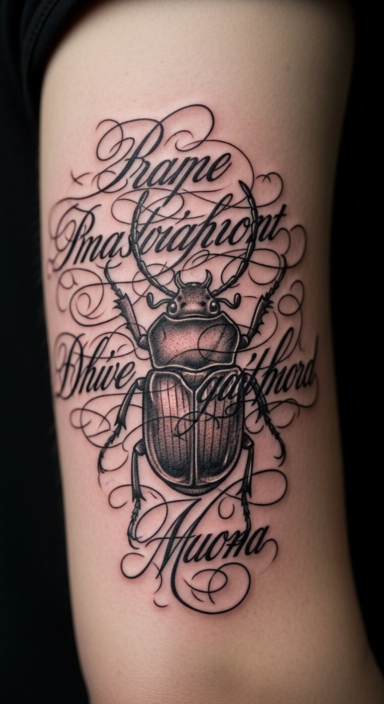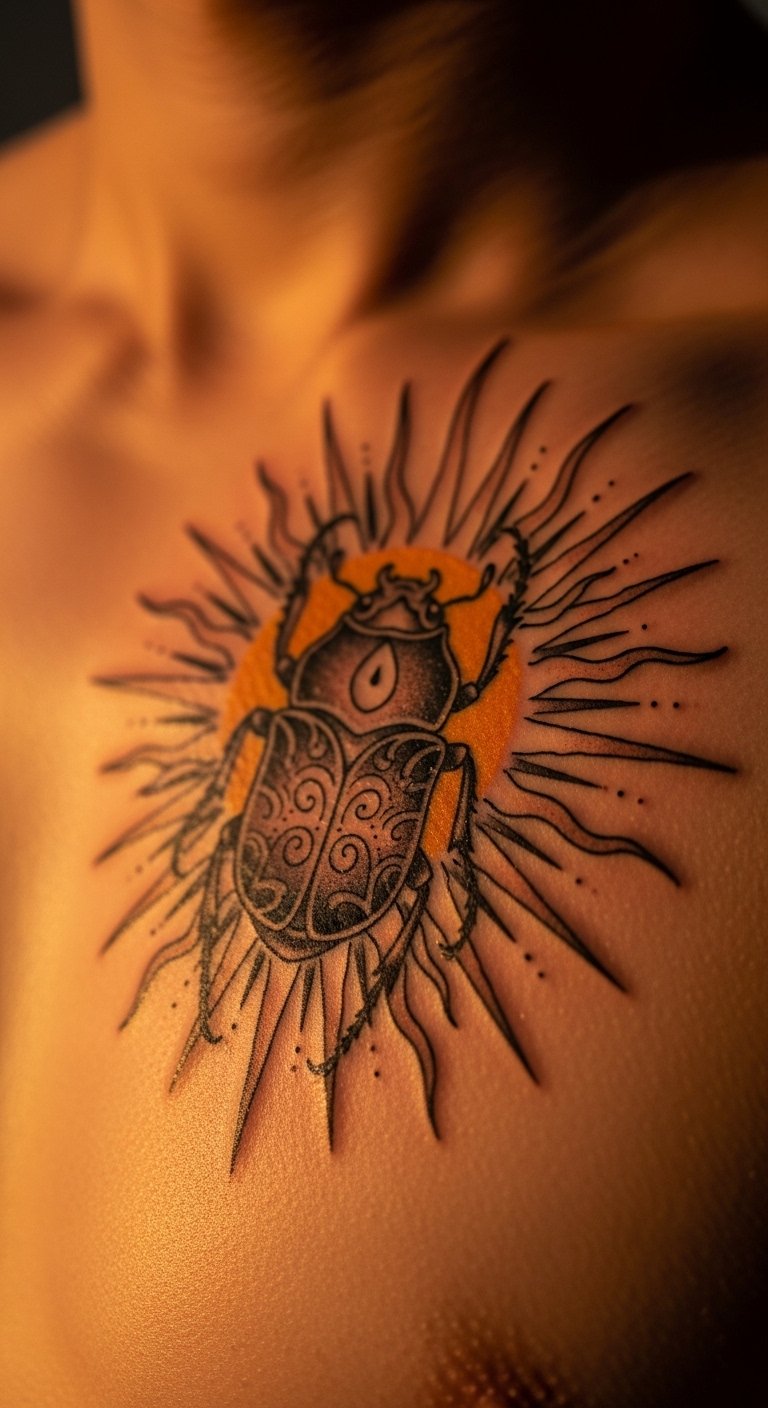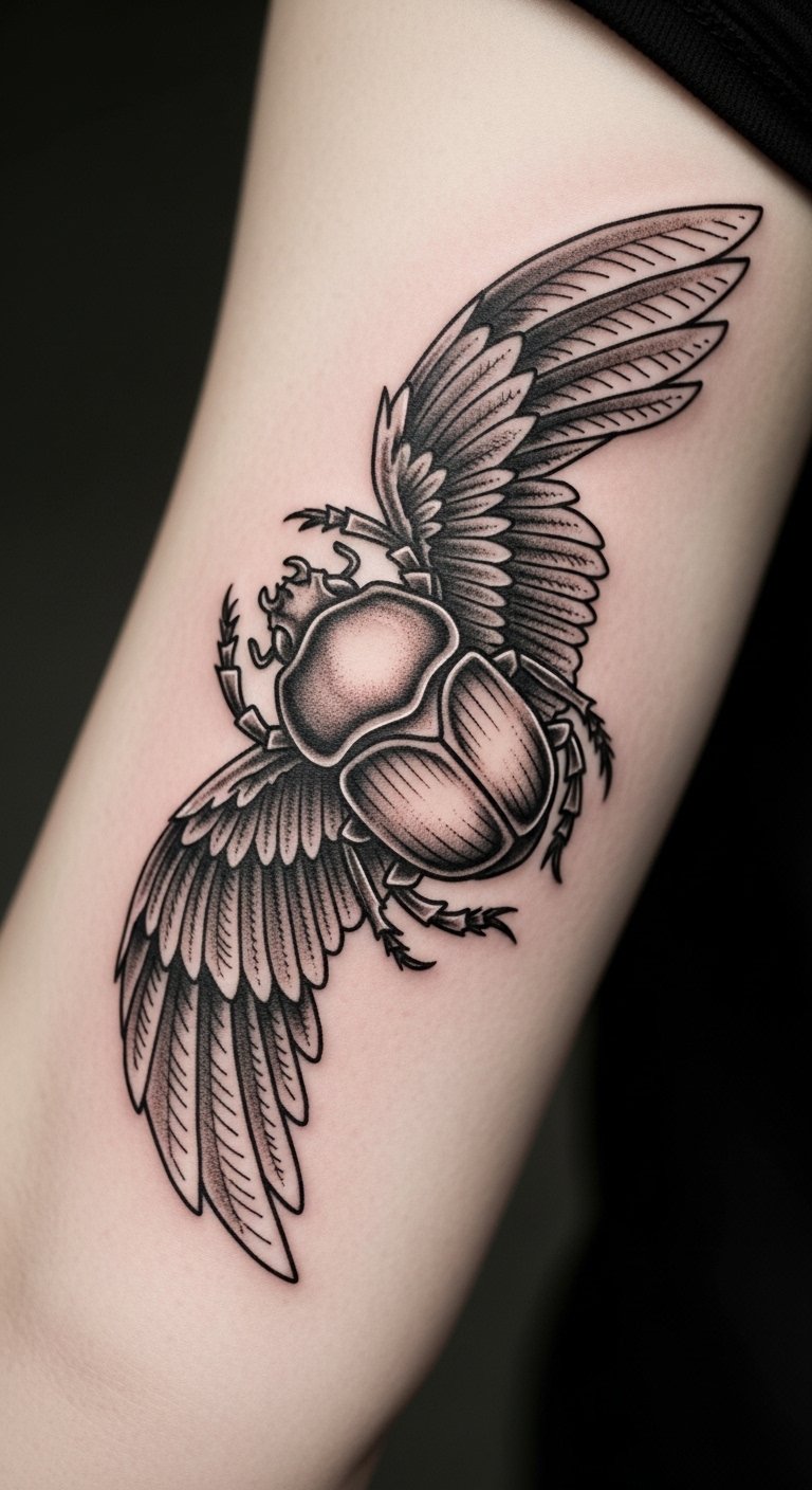 A scarab beetle tattoo nods to old Egyptian stories. It means new beginnings. Think of it as a sign of rising strong.