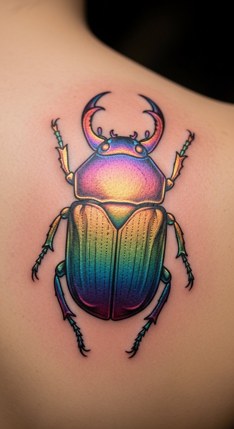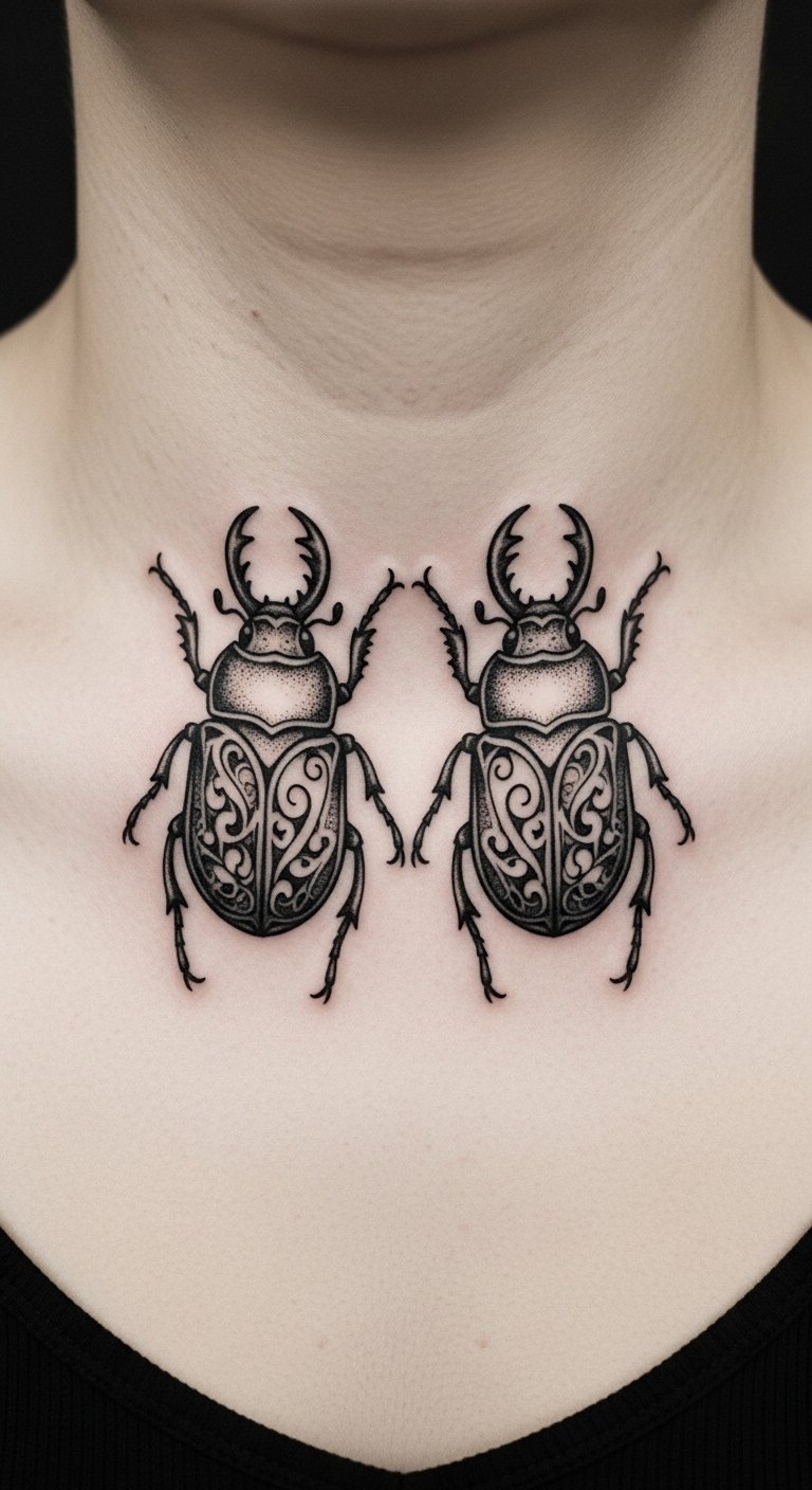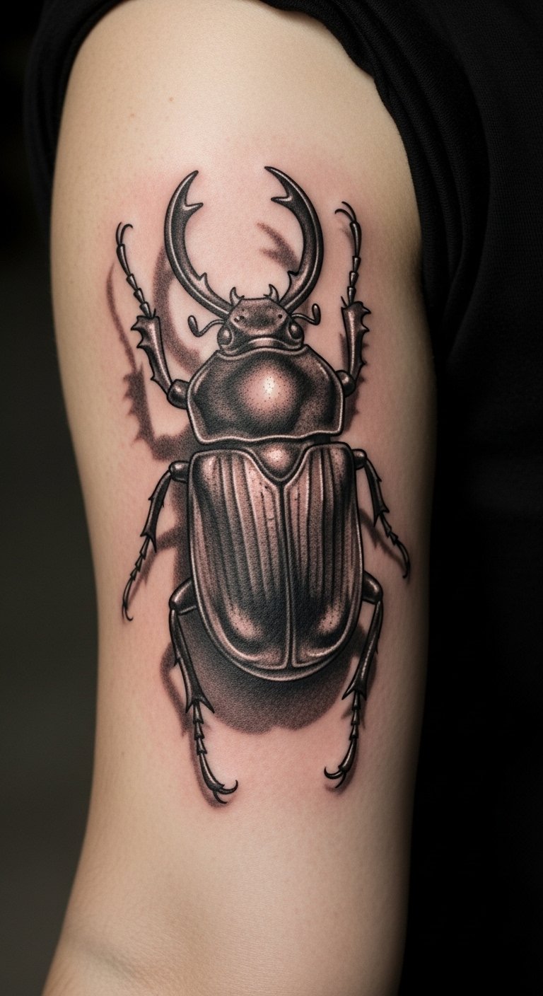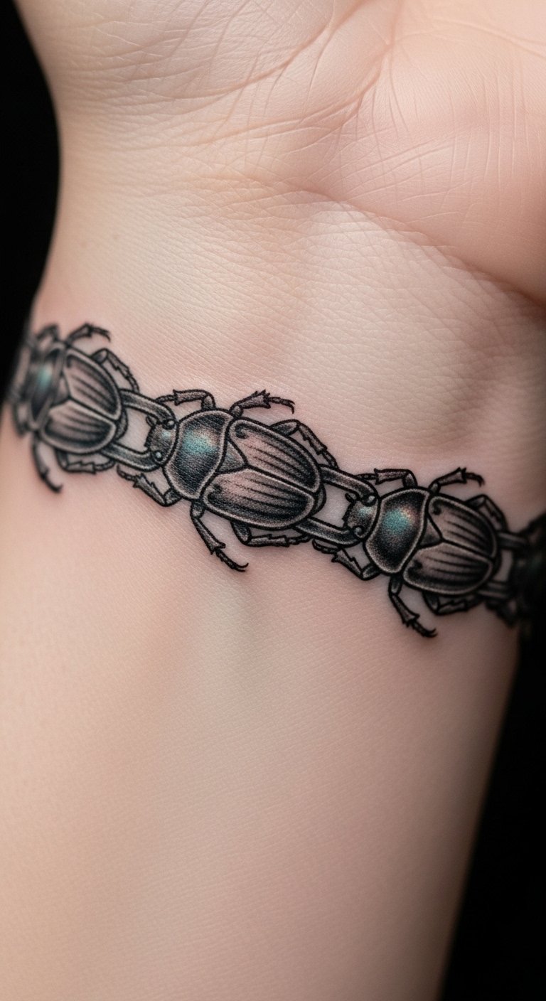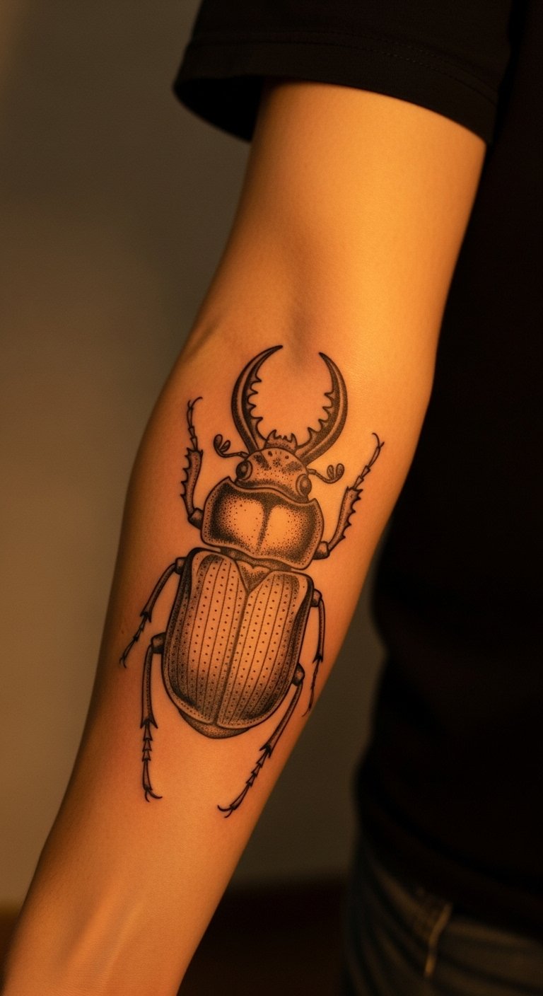 A scarab beetle tattoo nods to old Egyptian stories. It means new beginnings. Think of it as a sign of rising strong.