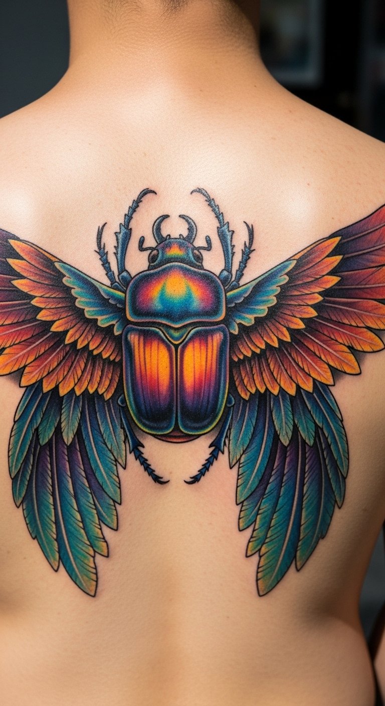 A colorful scarab with wings adds fun to your tattoo. It stands for protection and flight.