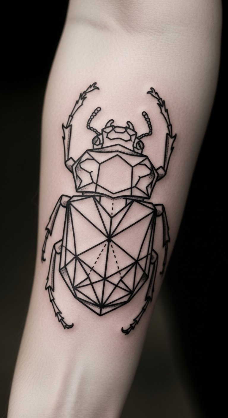 A geometric beetle pattern mixes shapes for a modern vibe. It means resilience through design.