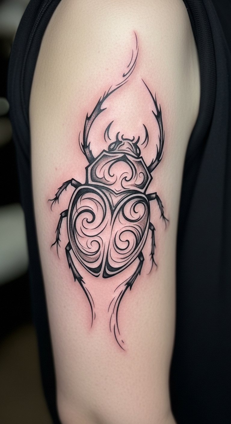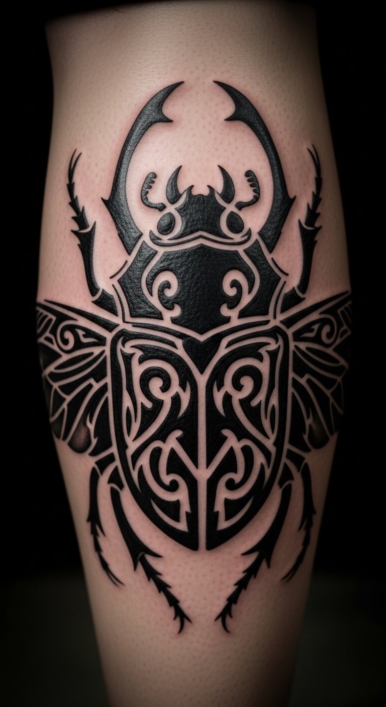Tribal beetle style uses thick lines for a fierce look. It represents strength from traditions.