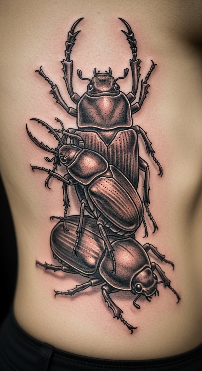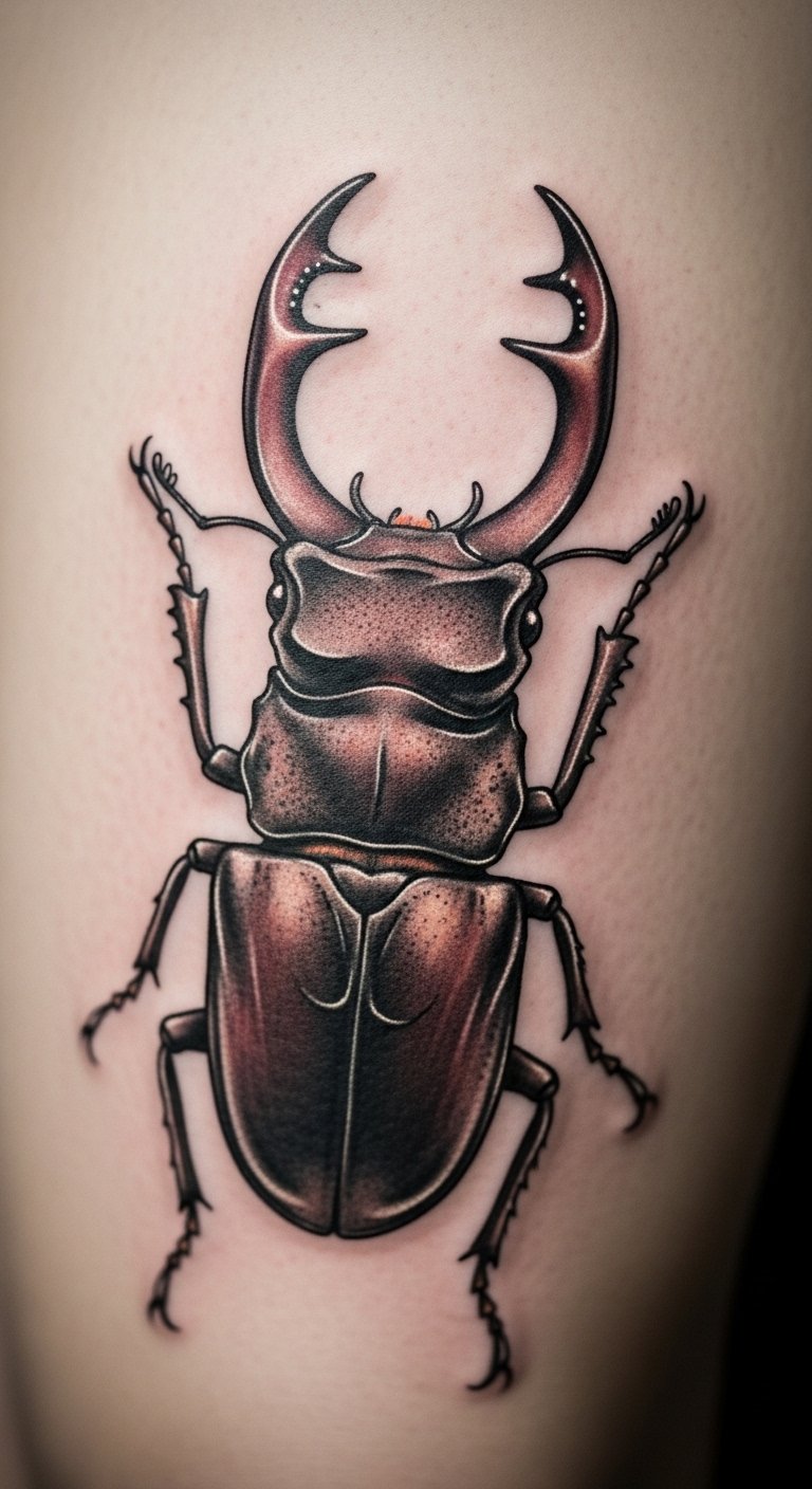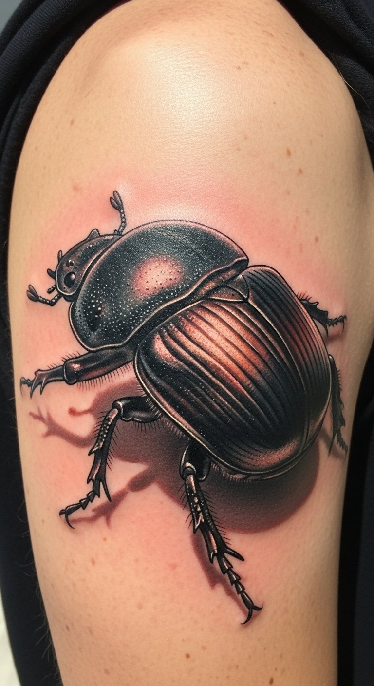 A realistic dung beetle design captures nature’s grit. It stands for hard work and cycles.