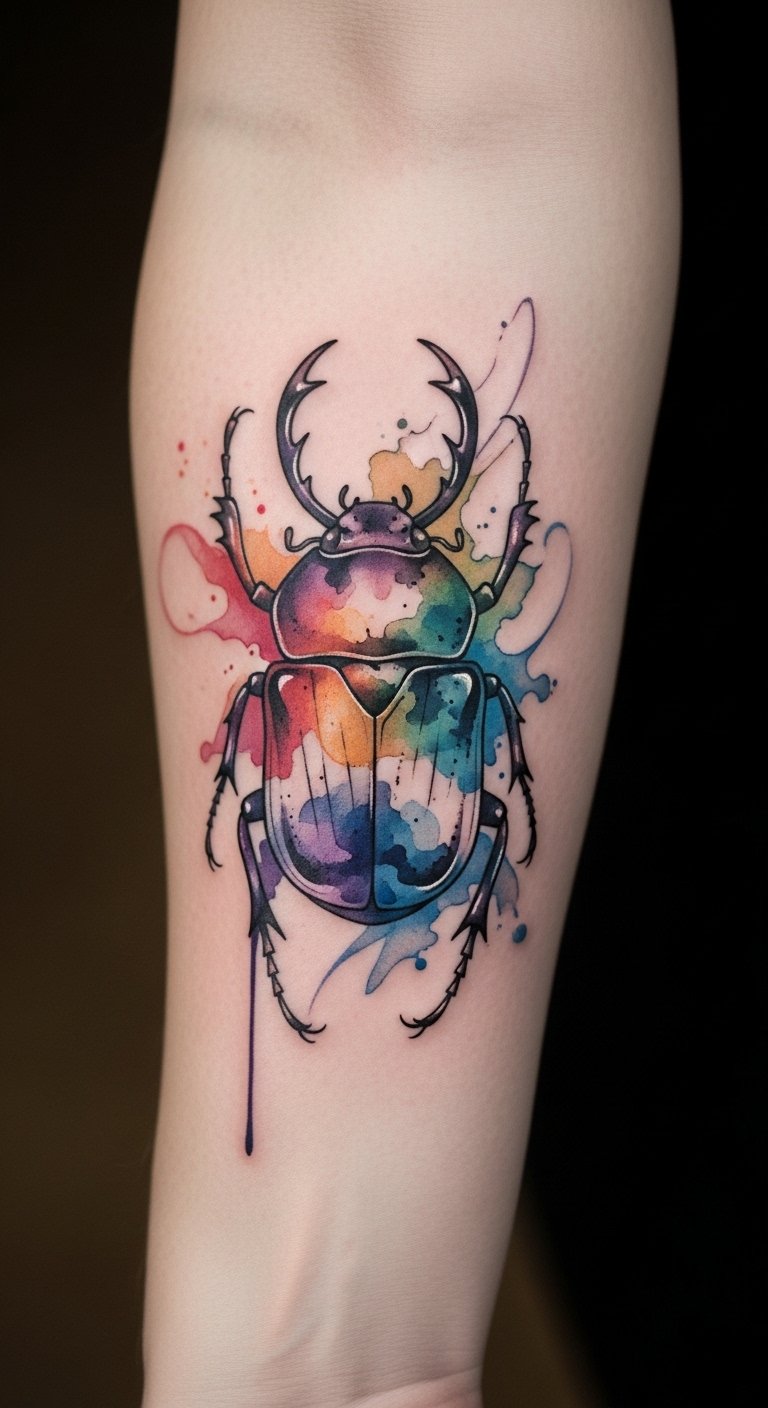 A watercolor beetle blend uses soft colors. It represents fluid change.
