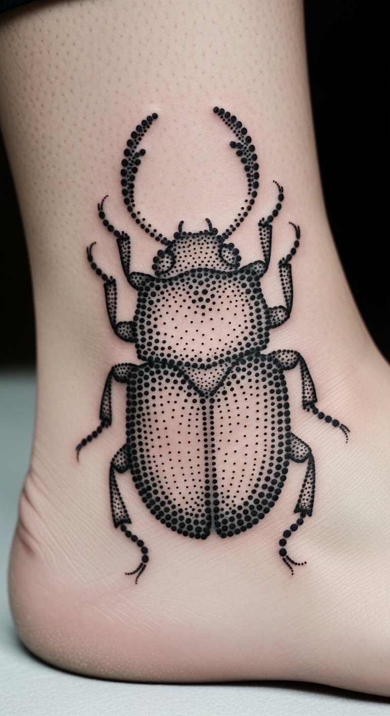 A dotwork beetle pattern uses dots for texture. It means detailed patience.
