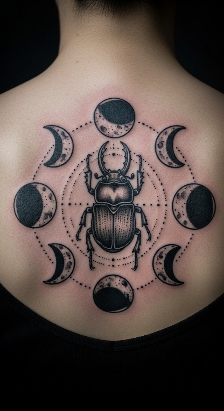 A beetle and moon phase ties to night cycles. It stands for phases of life.