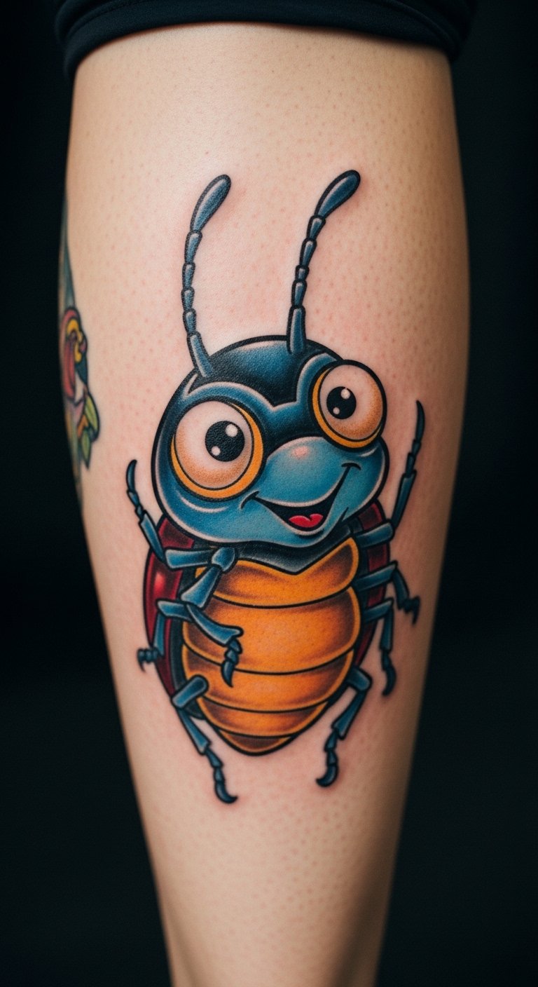 Cartoon beetle fun adds humor with big eyes. It means light-hearted vibes.