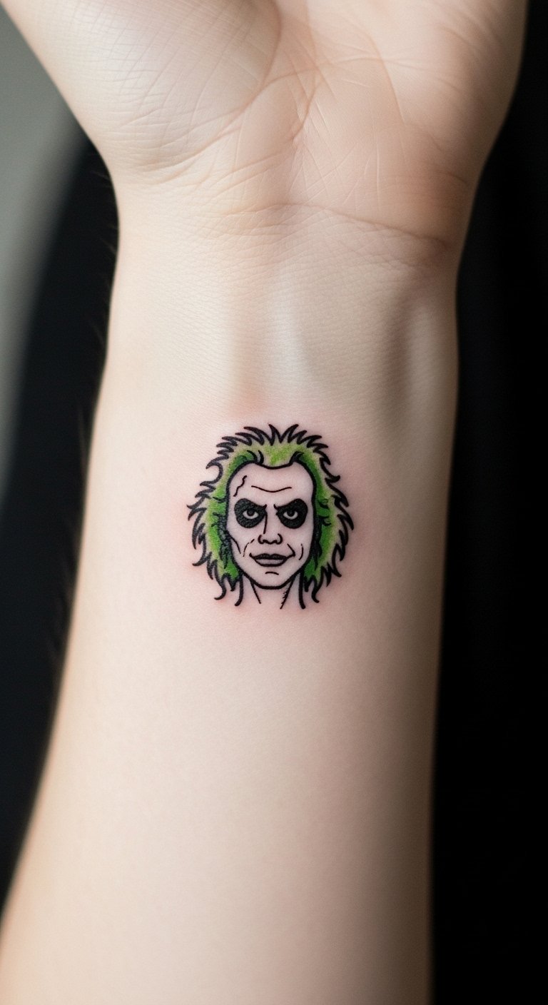 Picture a clean, simple outline of Beetlejuice’s face. This design keeps things understated yet bold. Start with a sketch on paper to test the look. It’s budget-friendly at under $100 for a small piece. Choose a spot like your wrist for easy hiding. Talk to a local artist who does line work—they often charge by the hour. Add a personal twist, like making the grin bigger. This tattoo says fun without overwhelming your style. Keep aftercare simple: use a fragrance-free lotion daily. You’ll love how it pops in everyday life. Go for it if you want something quick and meaningful.