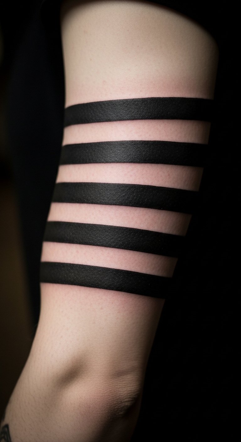 Wrap stripes around your arm. Band ideas on paper. Use bands for $140. Fit your bicep. Find band specialists. It looks cool. Maintain with lotion. Wear with pride. Make it stylish.