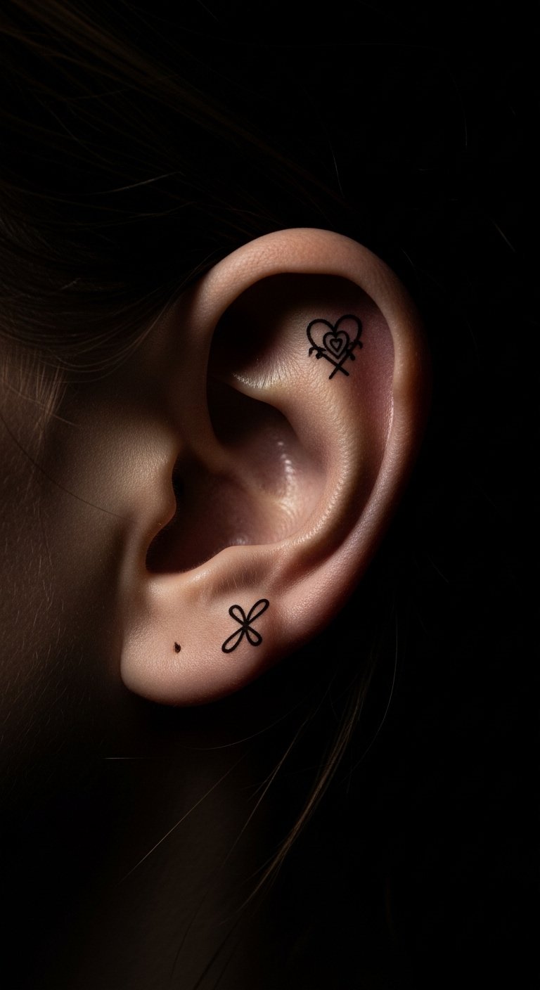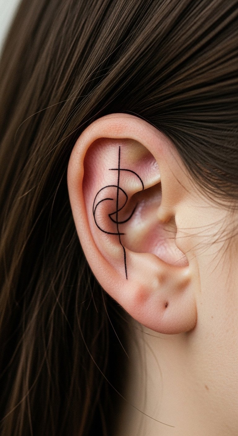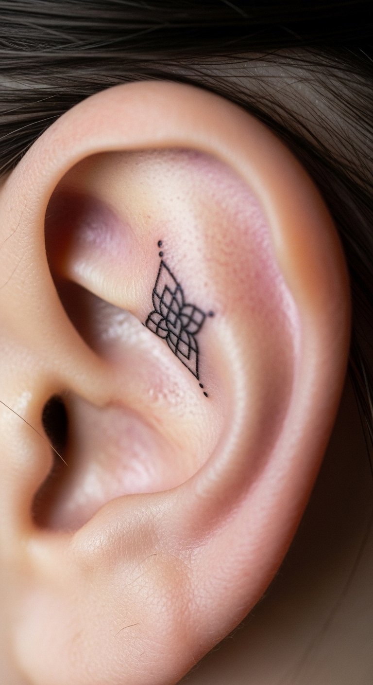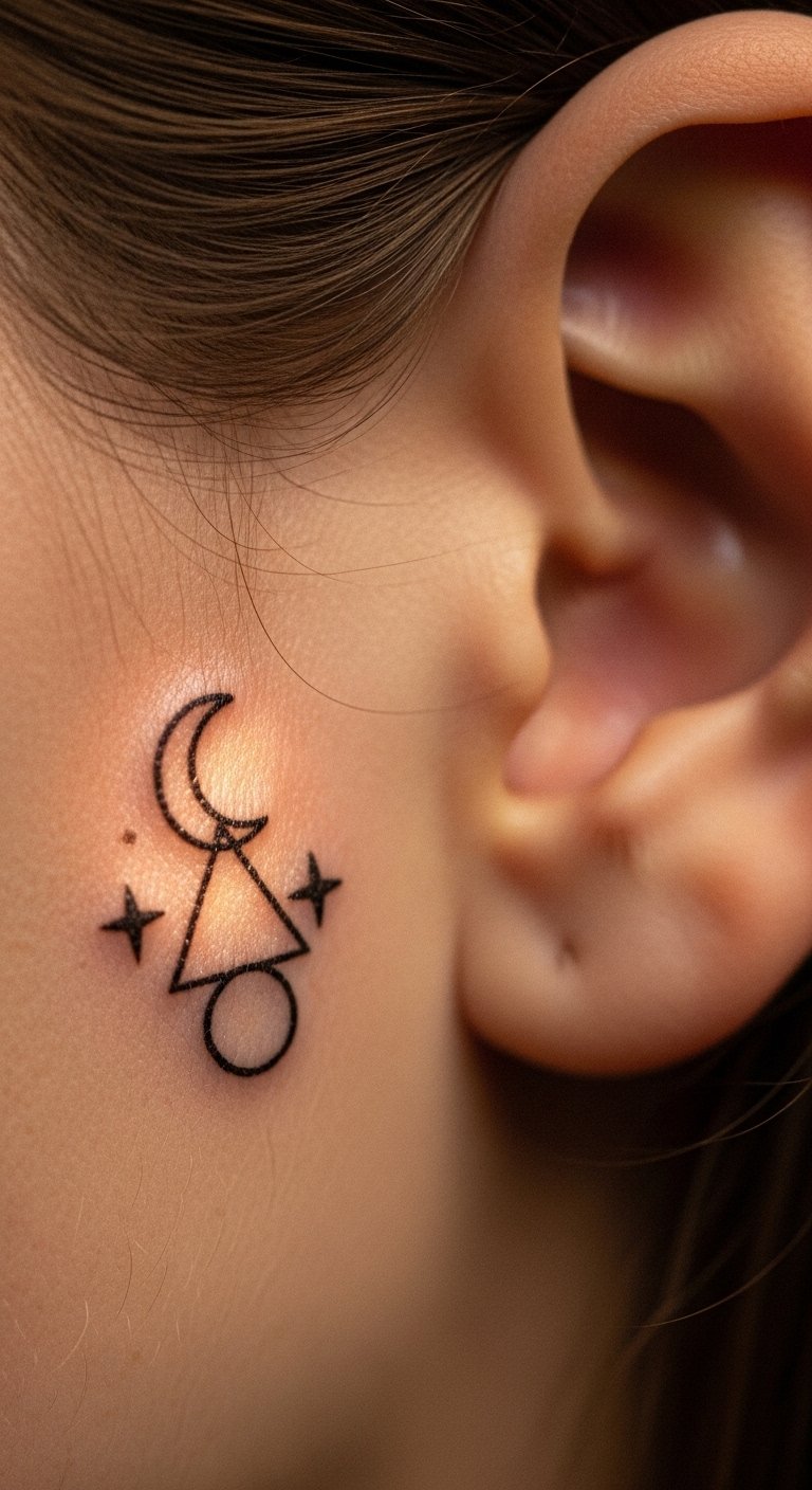 Small geometric lines make a clean choice for first-timers. Think a tiny triangle or abstract shape that fits the curve. Break it down: start with a sketch on paper using a pen. This helps you see how it looks. For budget tips, use free apps to draw ideas before visiting a shop. Keep costs low by choosing black ink only. Aim for a local artist who offers quick sessions. Practice hiding it with your hair for daily use. Bold lines hold up well over time. Try this at home: trace shapes on your skin with a washable marker to test placement. It takes minutes and saves money on changes later.