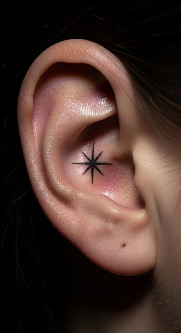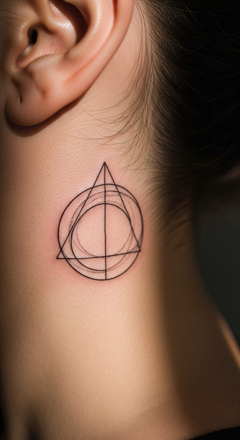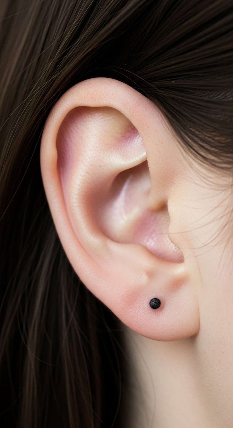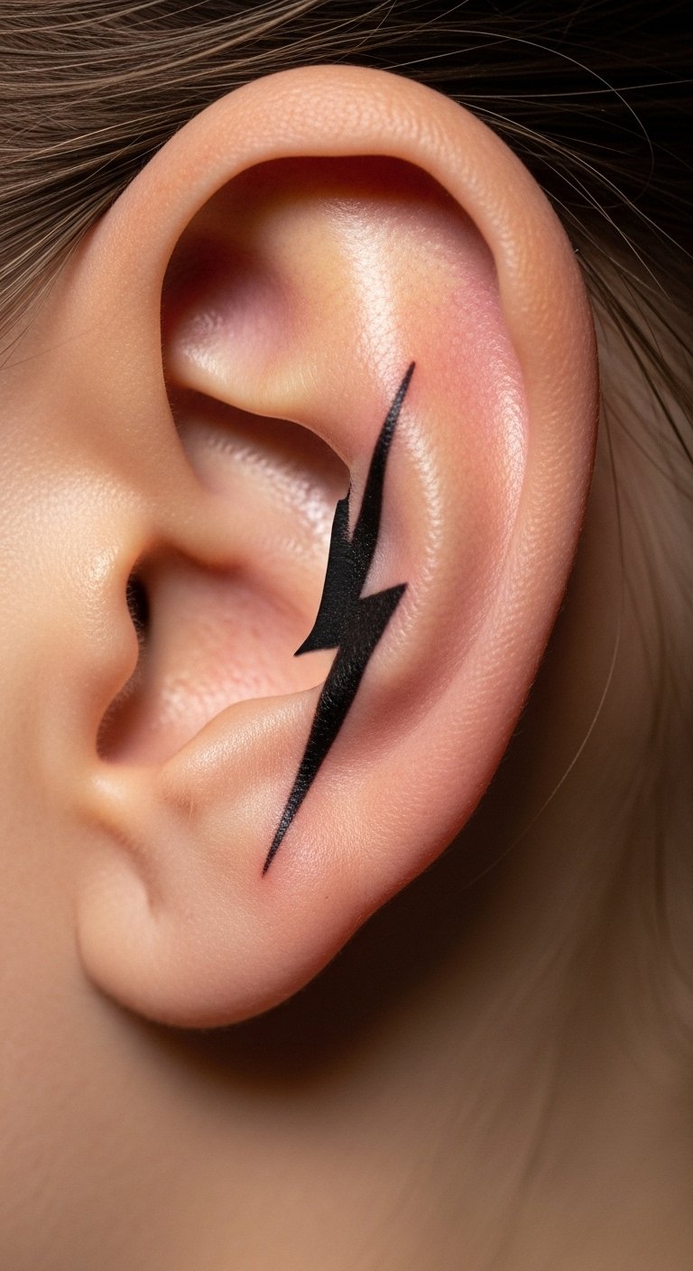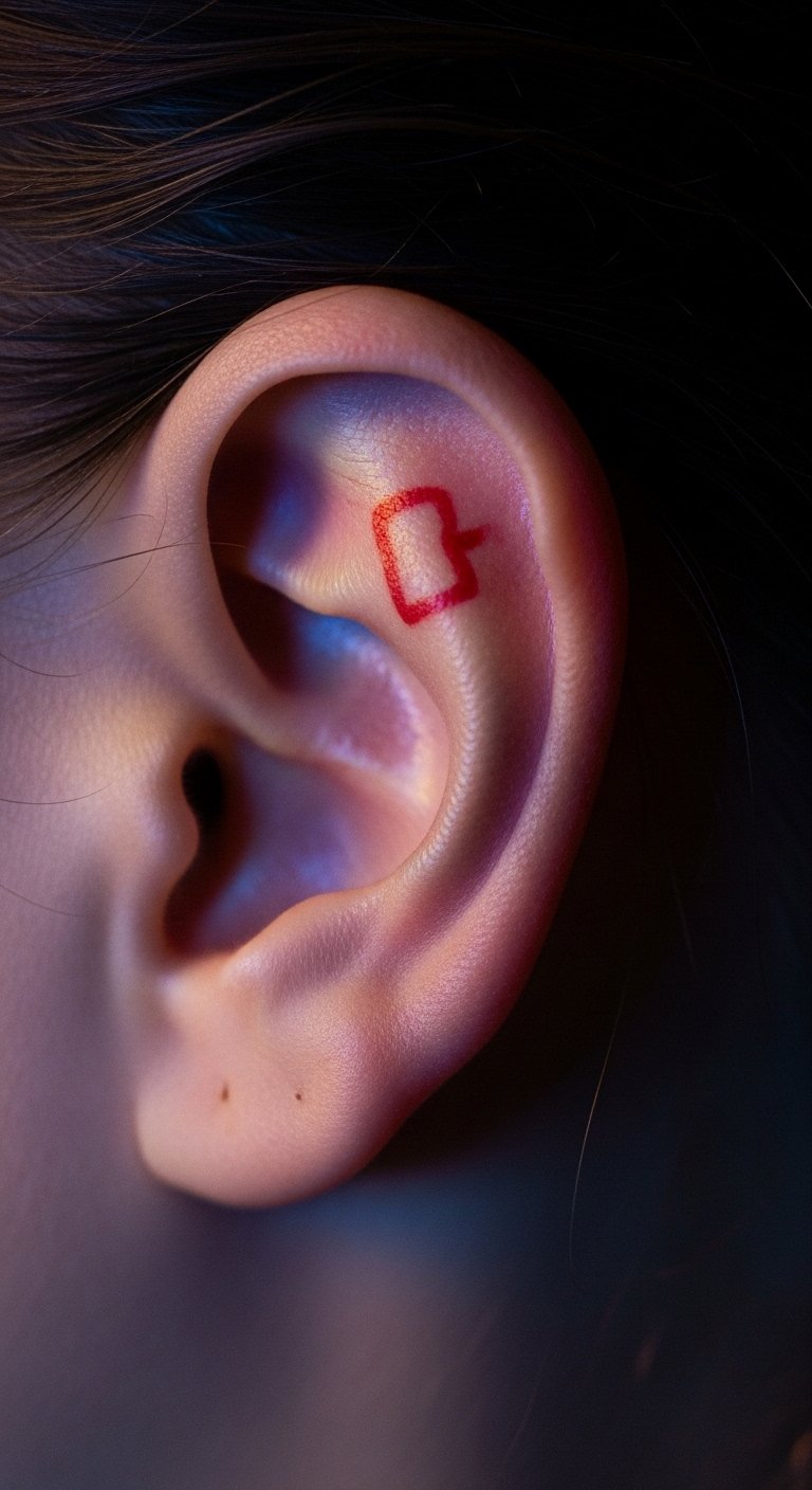 Small geometric lines make a clean choice for first-timers. Think a tiny triangle or abstract shape that fits the curve. Break it down: start with a sketch on paper using a pen. This helps you see how it looks. For budget tips, use free apps to draw ideas before visiting a shop. Keep costs low by choosing black ink only. Aim for a local artist who offers quick sessions. Practice hiding it with your hair for daily use. Bold lines hold up well over time. Try this at home: trace shapes on your skin with a washable marker to test placement. It takes minutes and saves money on changes later.