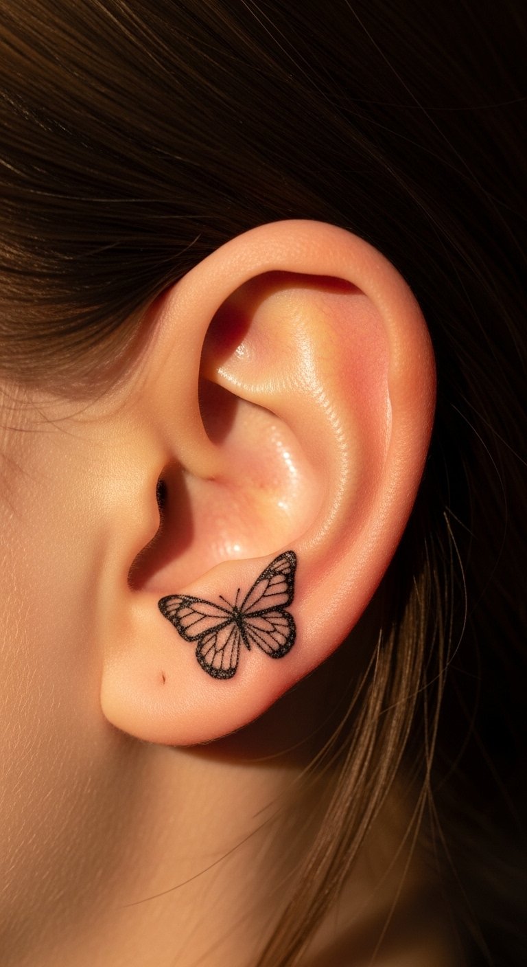 A butterfly tattoo shows growth in a compact way. Opt for wings that curve with your ear. Quick tip: sketch it freehand on a mirror. This gives a real view fast. Budget smart: download free butterfly stencils online and practice drawing. Choose a single-color option to keep prices down. Find a nearby shop with walk-in hours. Show it off by styling your hair for events. DIY at home with henna for a temporary test; it lasts days and is cheap. Focus on small sizes to avoid blur. These designs work well for subtle statements.