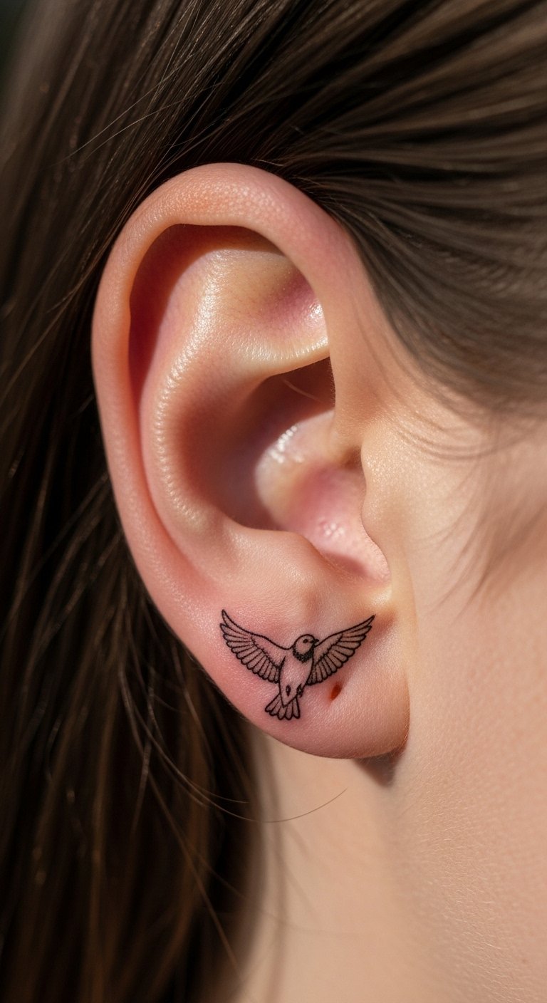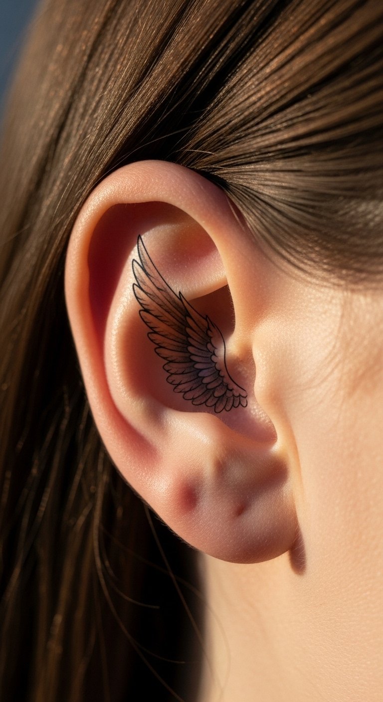 Wings offer a protective feel in a tiny space. Select a pair that follows the ear’s shape. Simple plan: trace wings on a photo of yourself. It takes little time. Save money by using free wing templates from apps. Opt for outline styles to lower fees. Look for budget-friendly tattoo events in town. Reveal it by pulling hair back on relaxed days. DIY tip: apply washable ink stamps at home to test; it’s quick and inexpensive. Keep designs straightforward for better wear.