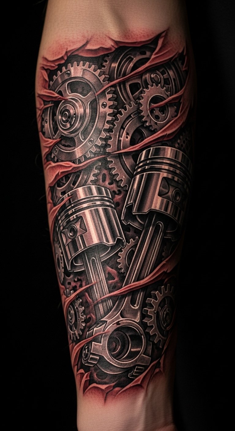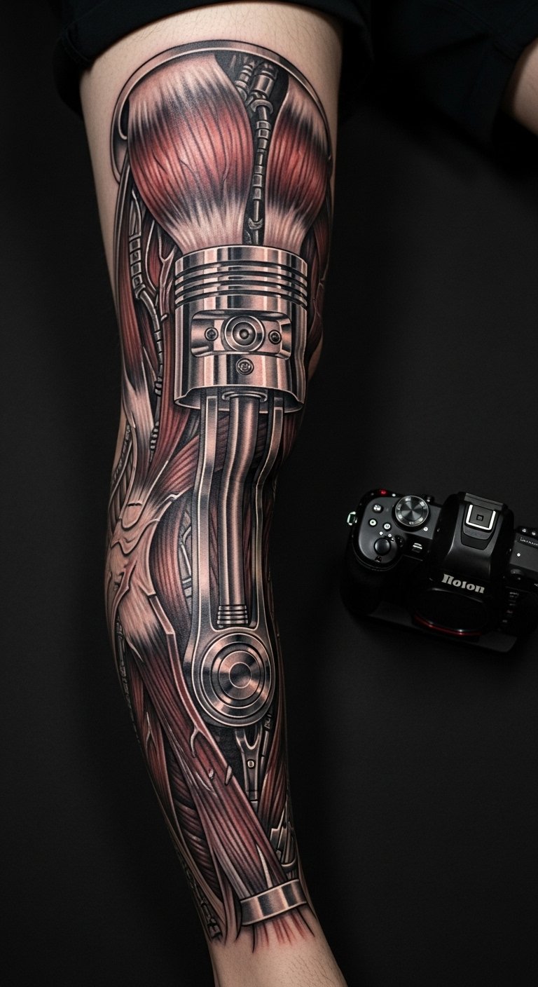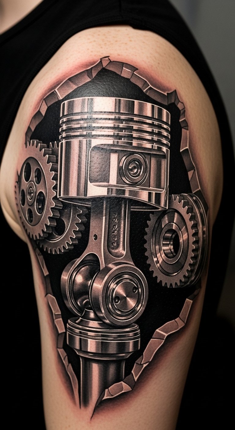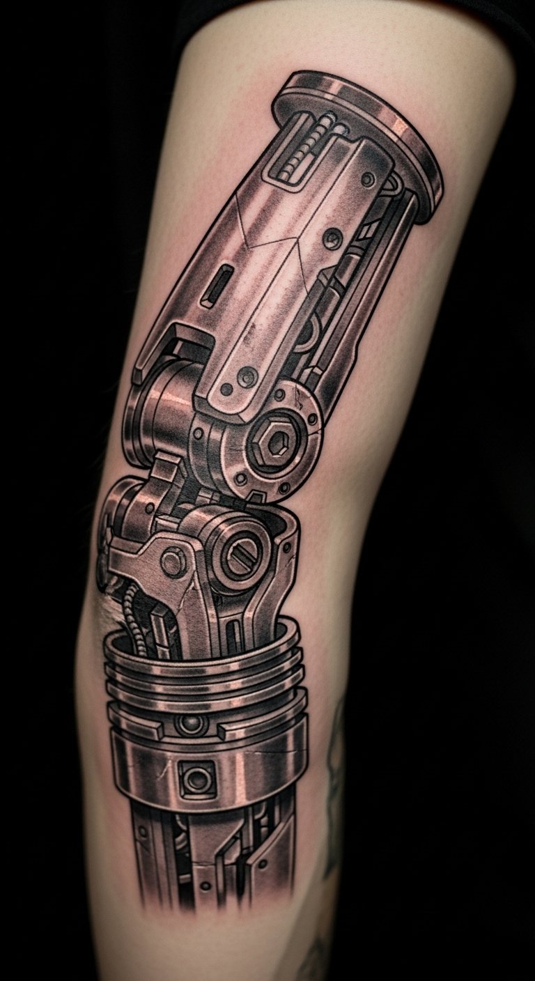 Piston joint tattoos on the shoulder give a strong, mechanical flow. Use free software to outline pistons on your computer. Adjust for your shoulder shape. Seek out budget studios at around $80 an hour. Keep appointments brief to manage fatigue. Bandage the spot with household items. Choose metallic shades for realism. This design fits people with broad builds and outdoor hobbies.