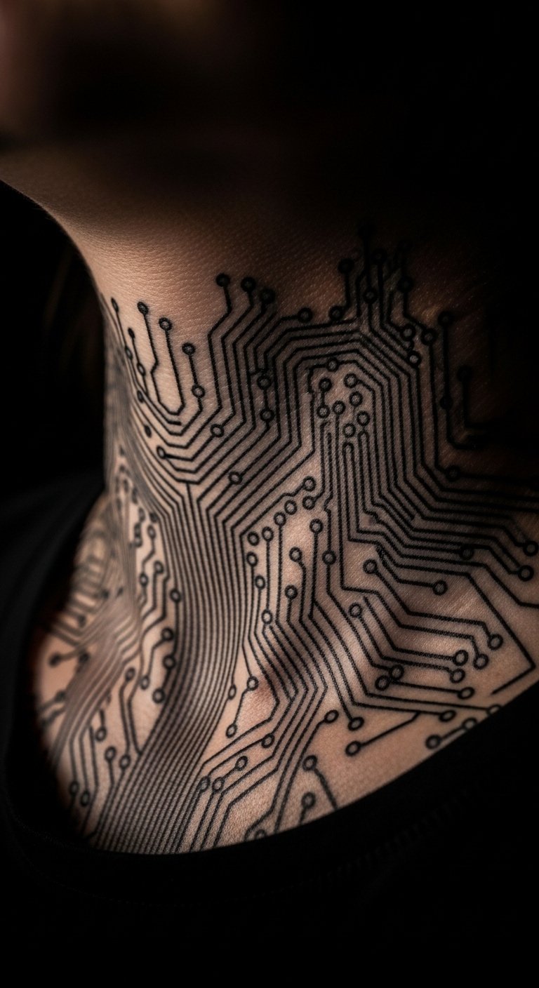 Circuit veins on the neck create a high-tech pulse. Sketch vein paths with ink on paper. Tailor to your neck length. Find deals on social media for under $90. Opt for quick sessions to avoid strain. Use scarves for protection post-tattoo. Incorporate blue tones for a vein effect. This style appeals to those who like subtle, daily statements.