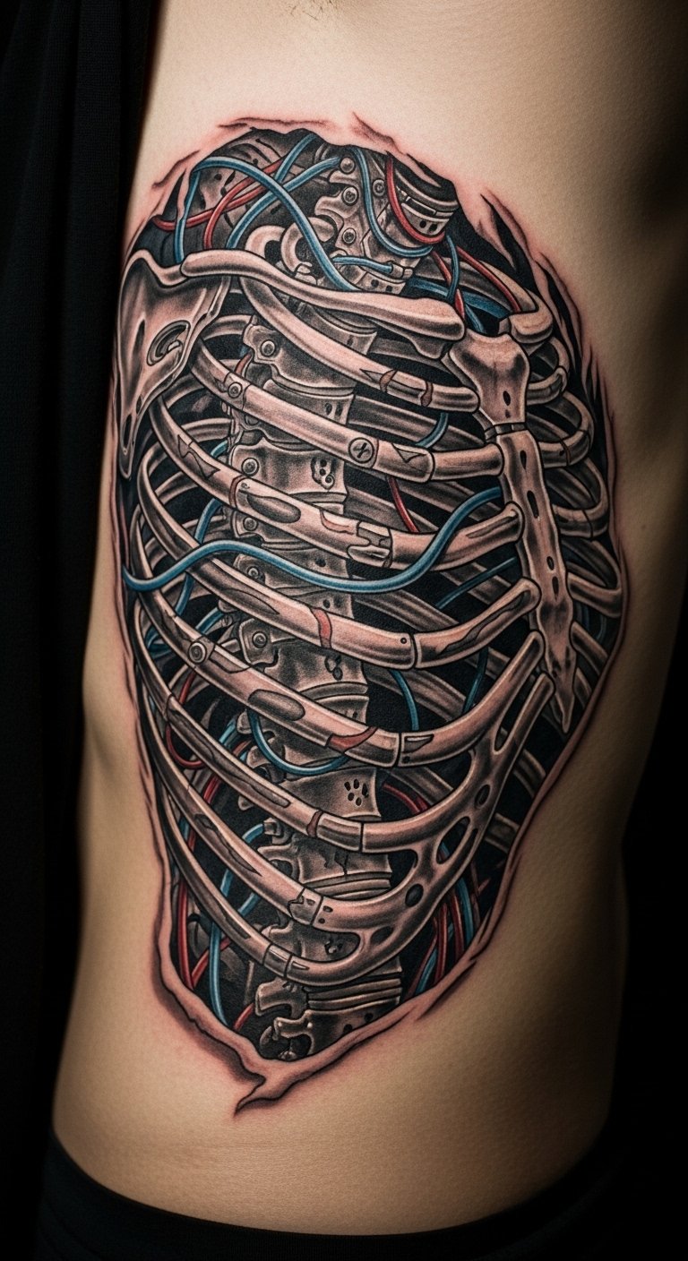 Mechanical ribcage tattoos on the side blend bones with tech. Practice drawing ribs on paper with a ruler. Match your body lines. Search for affordable options at $110. Break into manageable parts. Apply aloe from your fridge for comfort. Add gray shades for depth. This design suits those who prefer side art for clothing options.