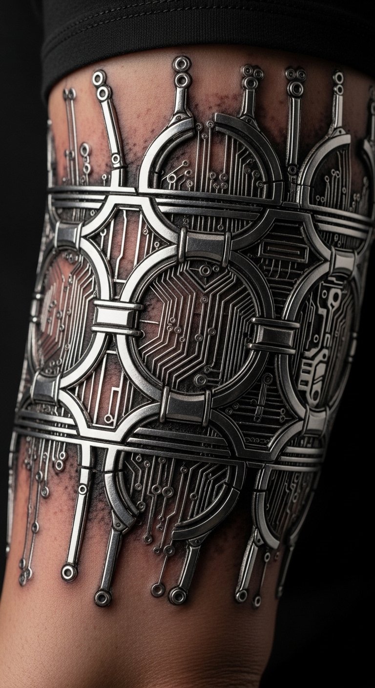 Cybernetic arm bands offer a banded machine look. Use string to trace band ideas on your arm. Do it yourself for free. Find artists offering $60 deals. Keep it to one session if possible. Cover with sleeves for recovery. Opt for shiny inks. This choice works for arm lovers and casual wear.