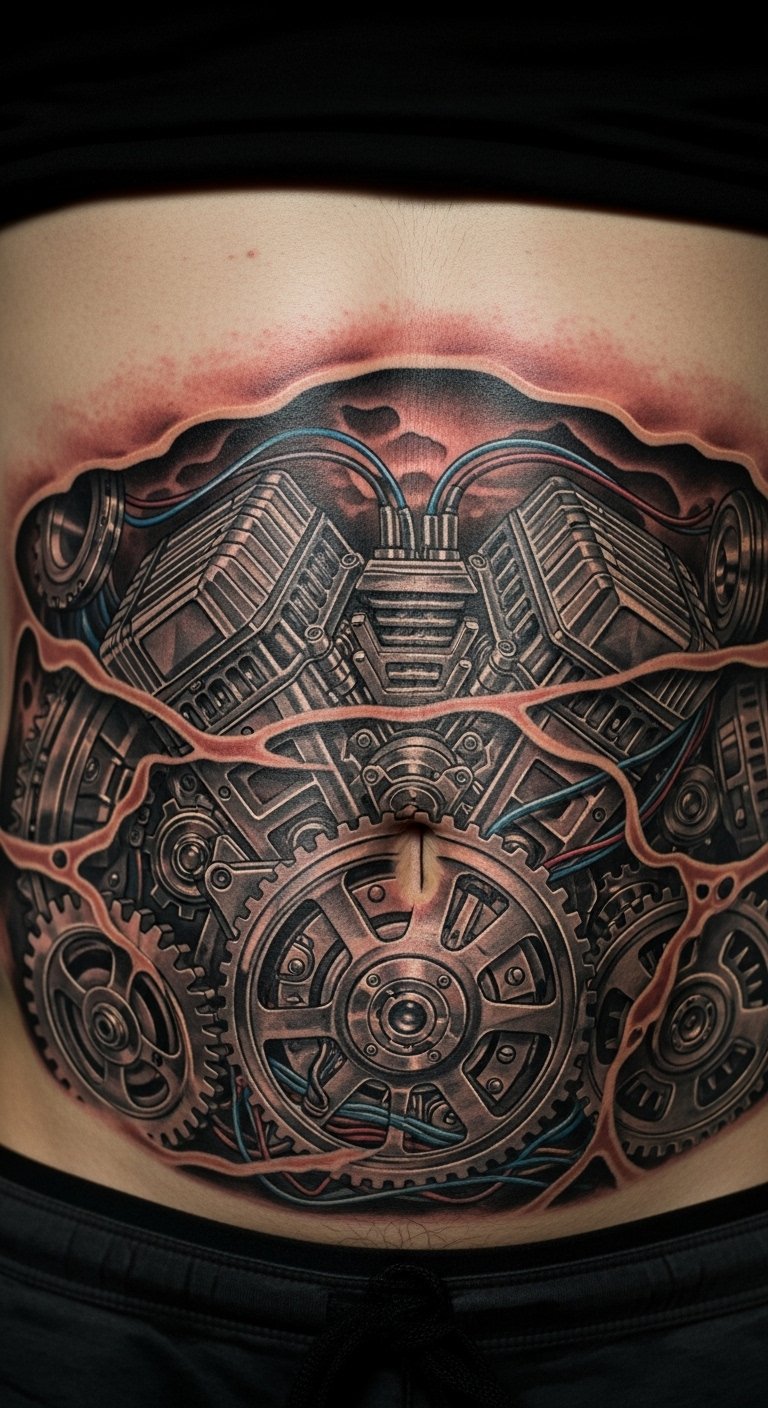 Engine core tattoos on the abdomen power up your midsection. Sketch engine parts on large paper. Fit to your abs. Check for sales at $130. Plan for multiple short visits. Use pillows for rest. Include red accents for energy. This idea fits fitness fans and hidden spots.