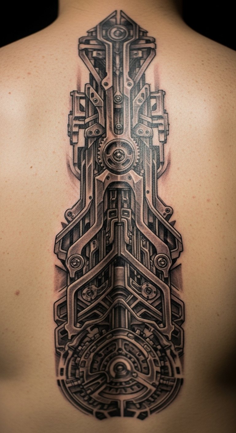 Mechanical spine extensions on the back elongate your design. Use a ruler to draw extensions on paper. Tailor to your back. Seek $100 packages. Divide into steps. Rest with support. Choose layered shades. This idea suits back enthusiasts.